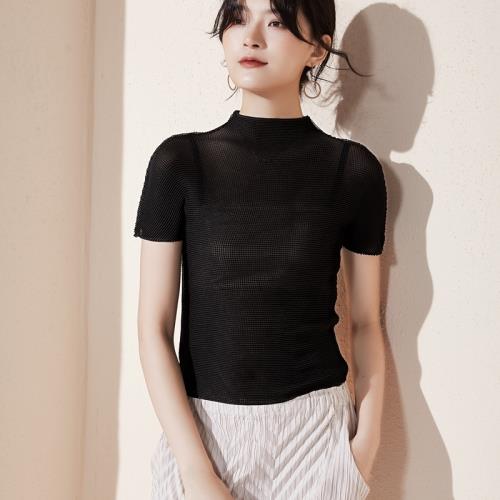 PY褶皺上衣女薄款夏季新品三宅修身打底小衫洋氣高檔短袖高領t恤