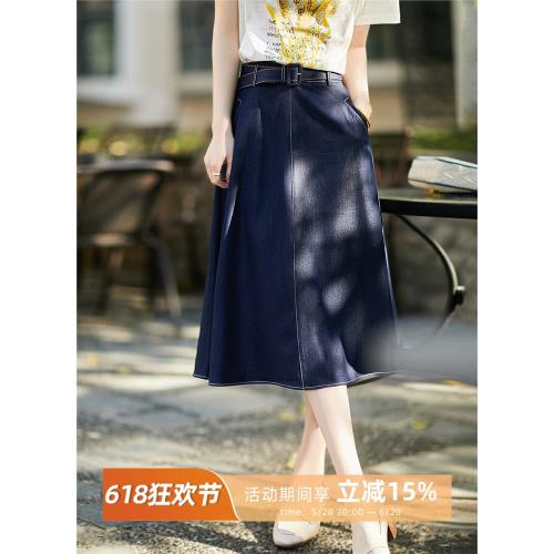 簡漫 輕盈透氣 精紡薄款牛仔半身裙 配腰帶中顯瘦A型傘裙春
