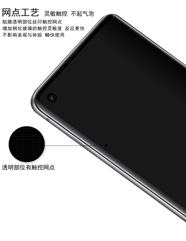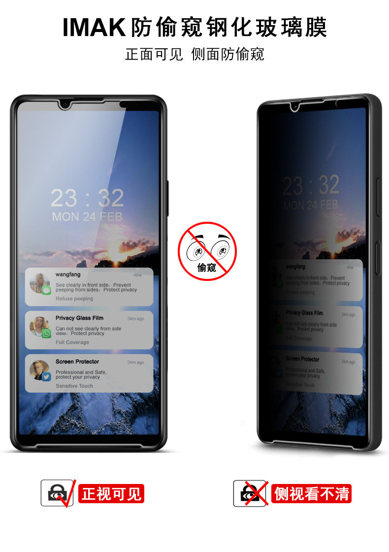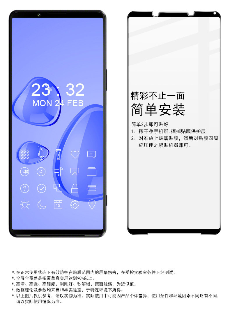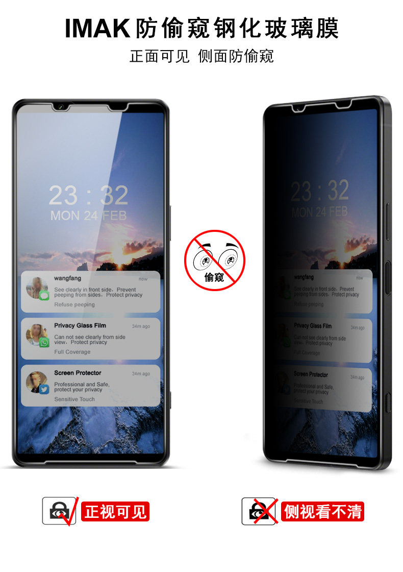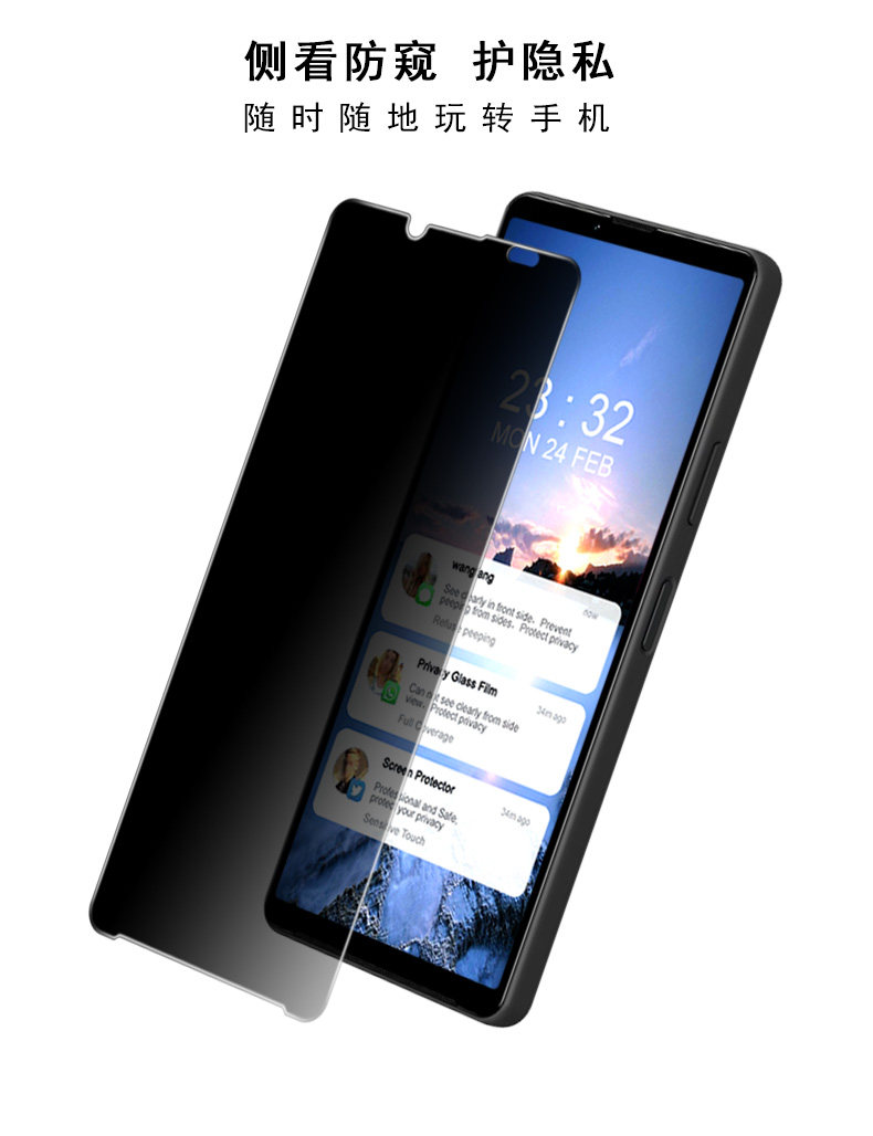 鋼化玻璃材質,鏡面觸感,靈敏觸控;正視可見,側視看不清;防偷窺護隱私,隨時隨地玩轉手機。采用AB膠自動吸附屏幕,氣泡自動排除,安裝簡單。
