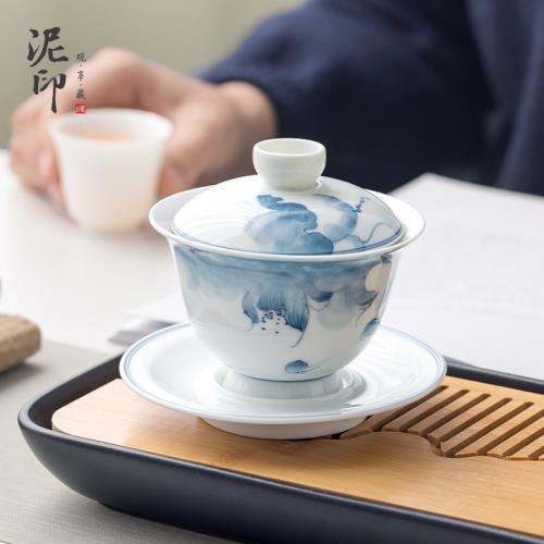 泥印手繪荷花陶瓷三才蓋碗單個家用景德鎮青花大號功夫泡茶碗茶杯