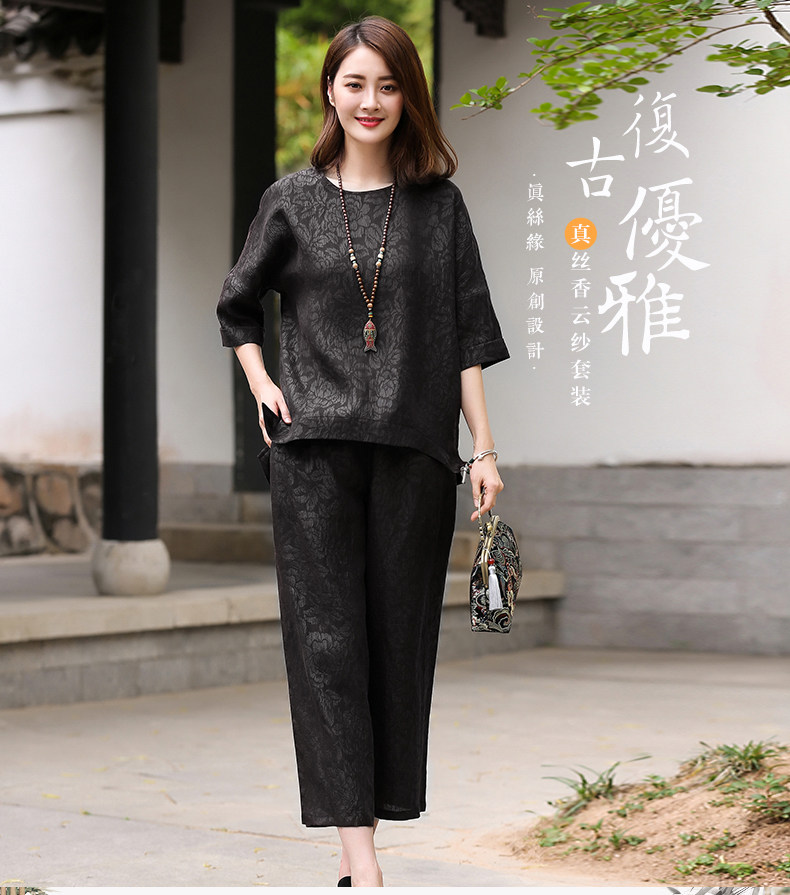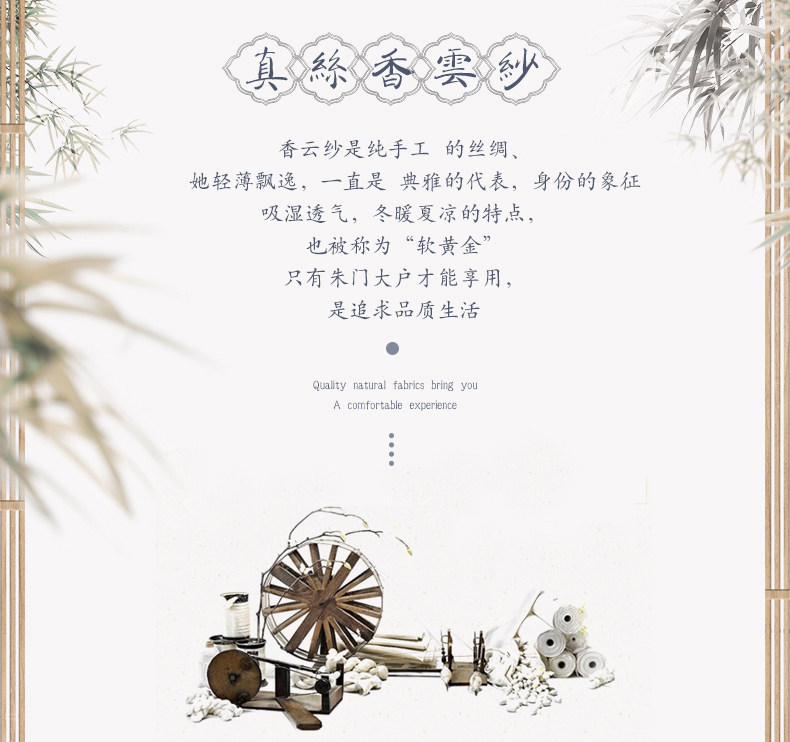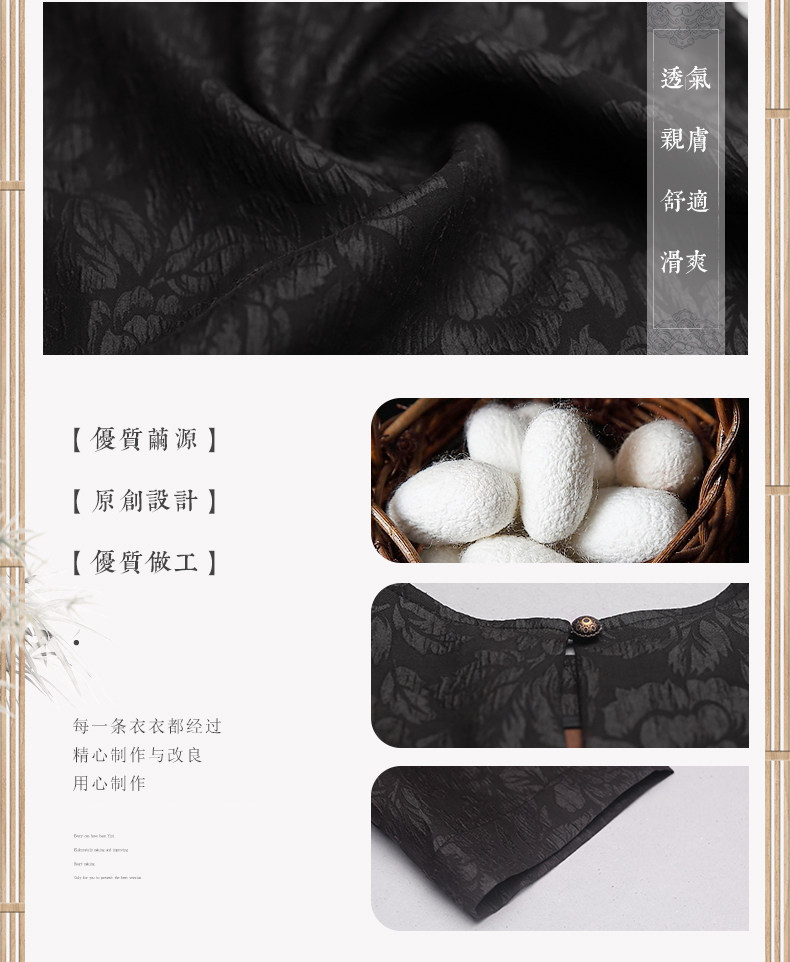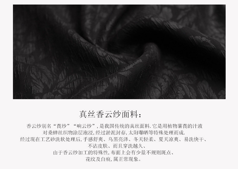 此款為正宗廣東產香云紗(溫馨提示:現在市面上充訴著大量非正規工藝制作的香云紗,這種次質量的面料穿在身上有不透氣、容易粘身等特點)正宗的香云紗只產自廣東,它是天然植物薯莨的汁液對真絲涂層泡浸,淤泥封存,太陽曝曬而成,穿著自然清涼,由于制作特殊性,布面會有少量不規則斑點屬正常現象