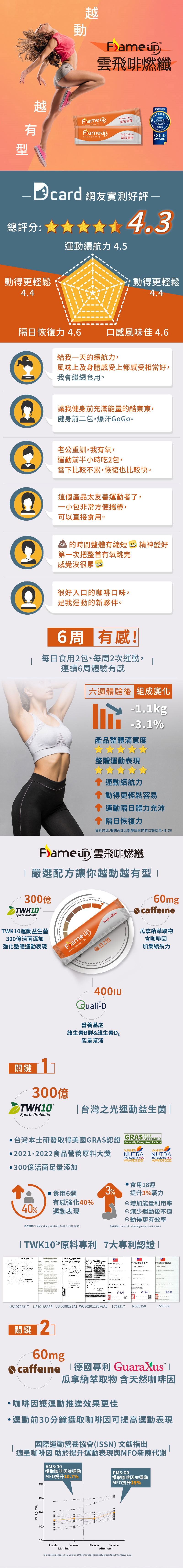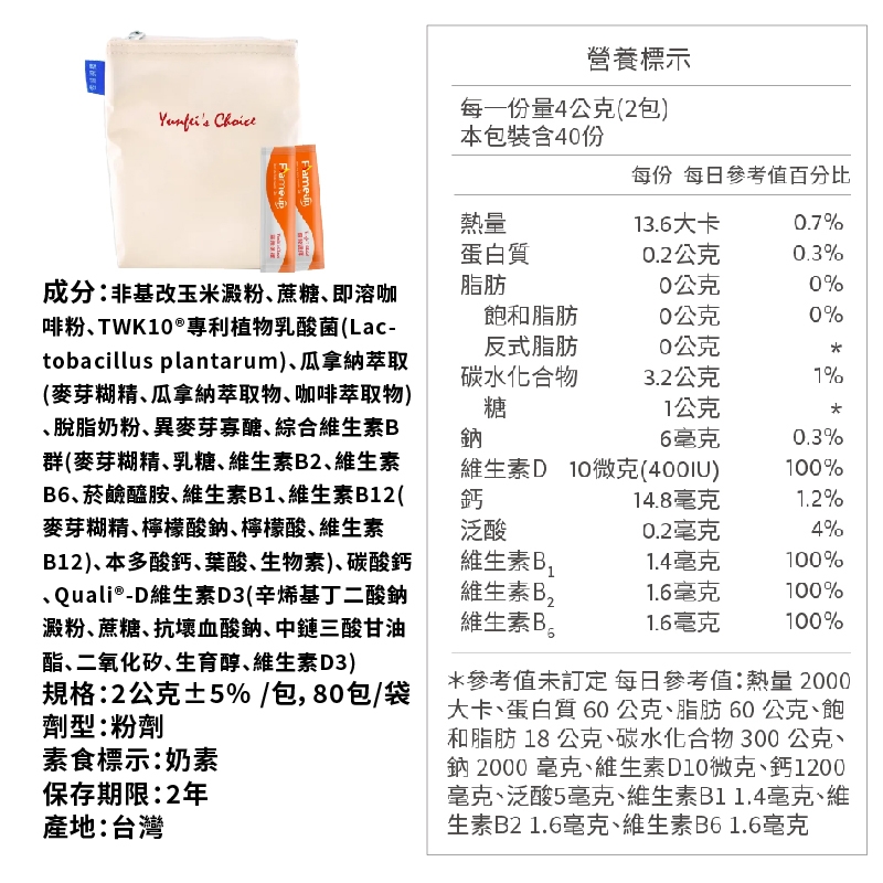 成分:非基改玉米澱粉、蔗糖、即溶咖啡粉、TWK10®專利植物乳酸菌(Lactobacillus plantarum)、瓜拿納萃取(麥芽糊精、瓜拿納萃取物、咖啡萃取物)、脫脂奶粉、異麥芽寡醣、綜合維生素B群(麥芽糊精、乳糖、維生素B2、維生素B6、菸鹼醯胺、維生素B1、維生素B12(麥芽糊精、檸檬酸鈉、檸檬酸、維生素B12)、本多酸鈣、葉酸、生物素)、碳酸鈣、Quali®-D維生素D3(辛烯基丁二酸鈉澱粉、蔗糖、抗壞血酸鈉、中鏈三酸甘油酯、二氧化矽、生育醇、維生素D3)