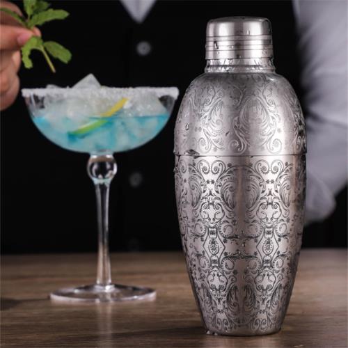 臺式優質304不銹鋼搖酒壺 蝕刻刻花調酒器雪克壺 三段式搖壺500ml