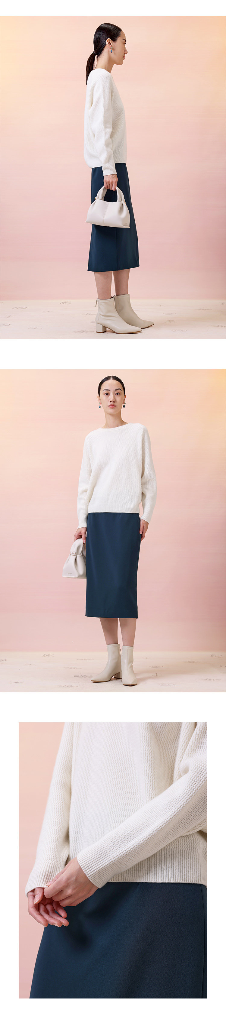 | 產品屬性:羊絨羊毛簡約圓領毛衣 -《純真》 面料成分:30%山羊絨+70%羊毛 紗線支數:2/26NM 衣服重量:M碼約415g |