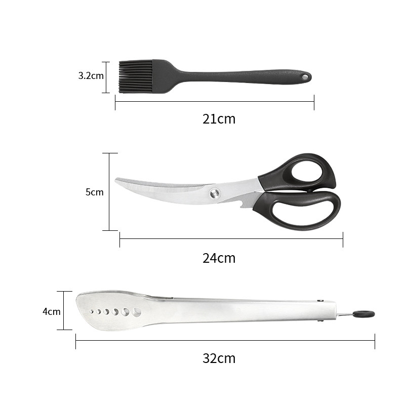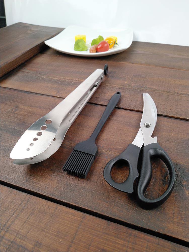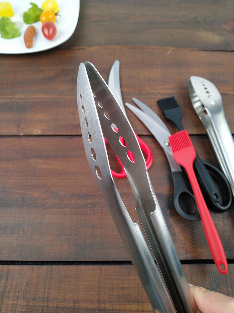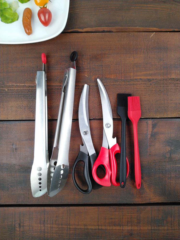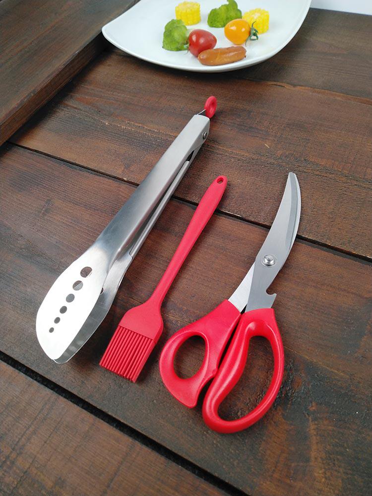 材質:刷子,耐高溫硅膠。剪刀, 3Cr13不銹鋼 +PP。食物夾,304不銹鋼。