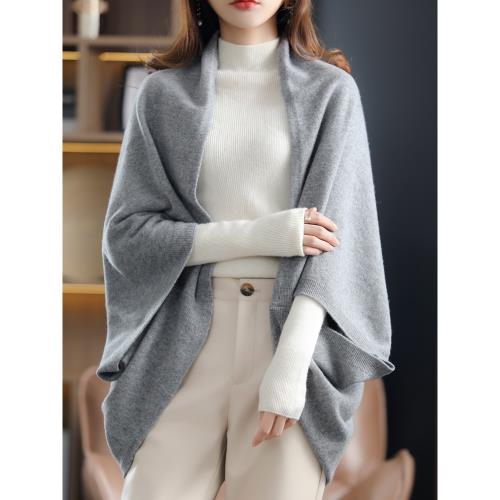 100%澳洲純羊毛披肩外搭女秋冬季中長款洋氣針織開衫寬松毛衣外套