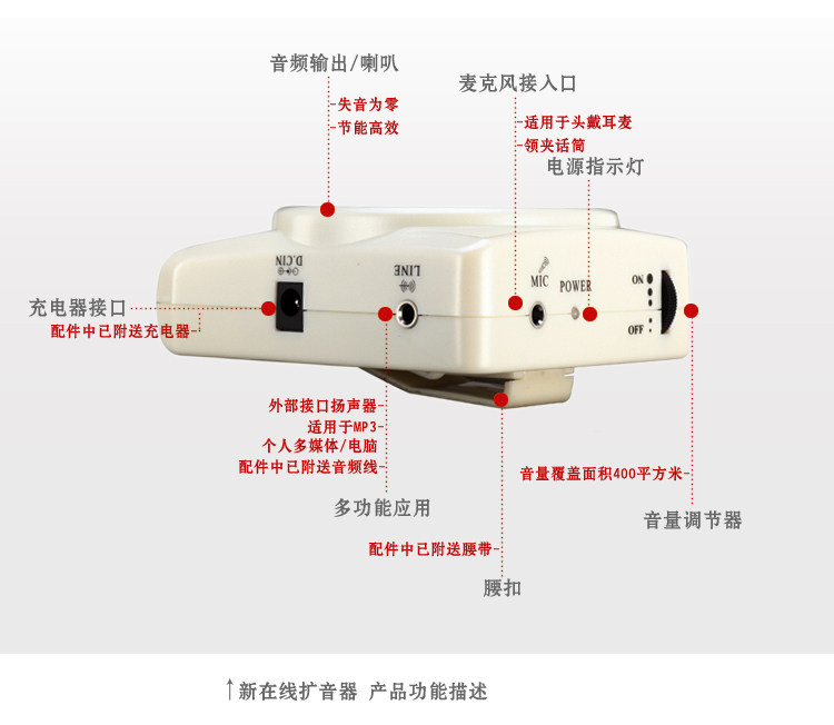 官方標配內容:擴音器主機、充電器、耳掛式話筒、腰帶、音頻線,說明書。