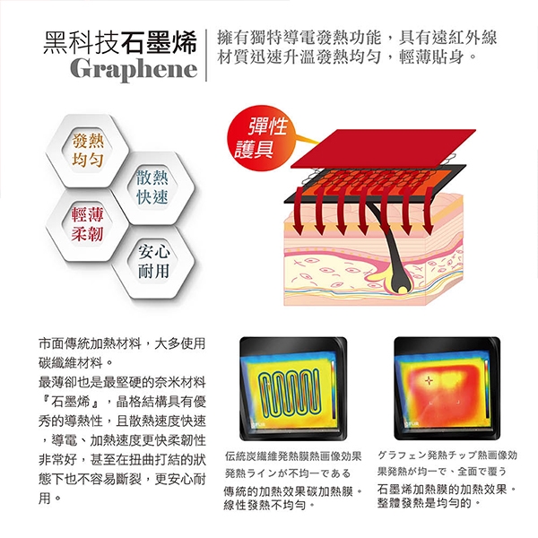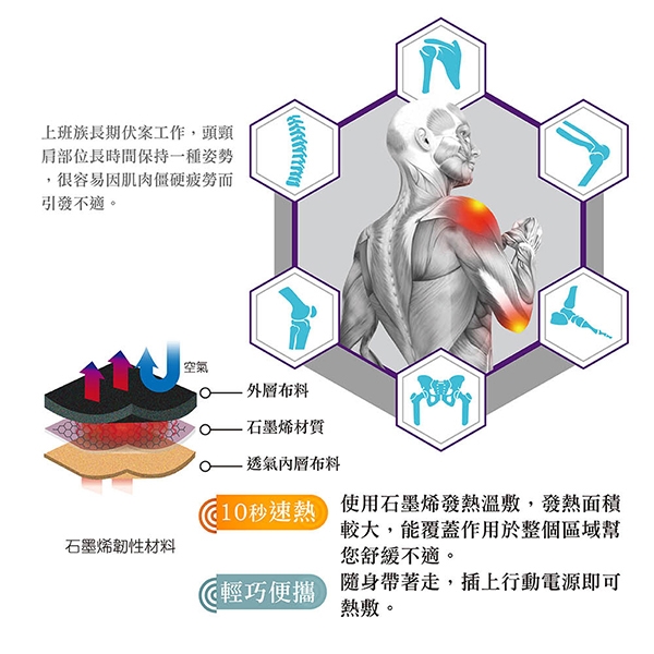 使用石墨稀發熱溫敷、發熱面積較大、能覆蓋作用於整個區域幫您舒緩不適。