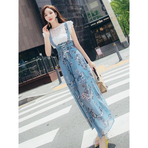 套裝女夏飛飛袖白色蕾絲上衣雪紡印花背帶裙氣質時尚名媛兩件套