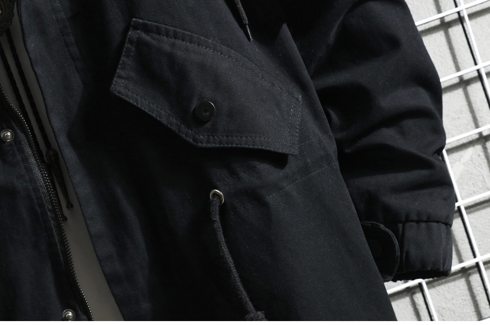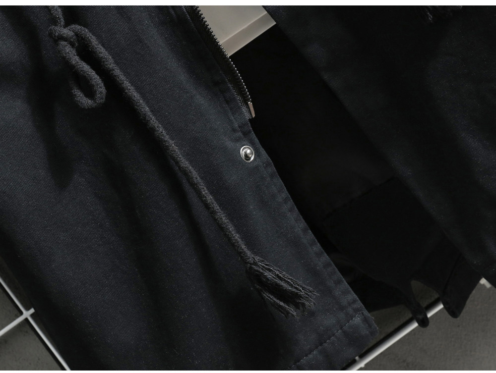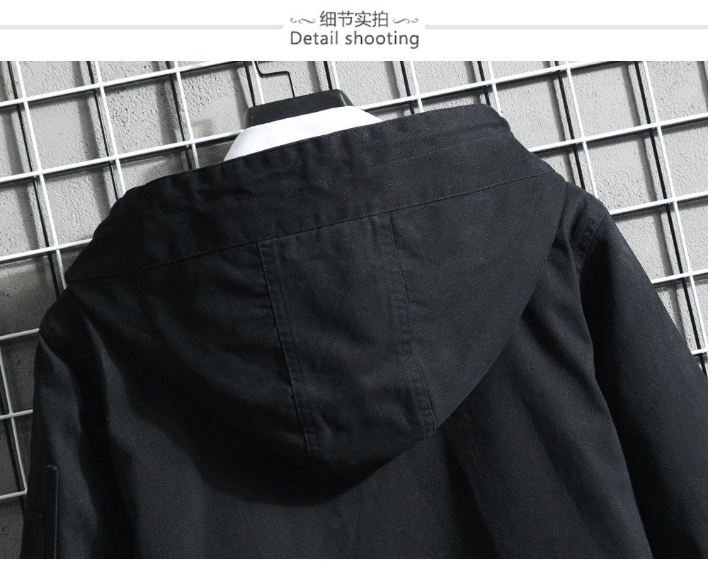 【款式】中長款,約到大腿中間左右。高口袋、大兜帽設計,款式新穎。