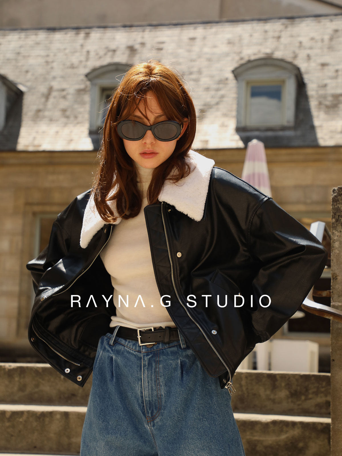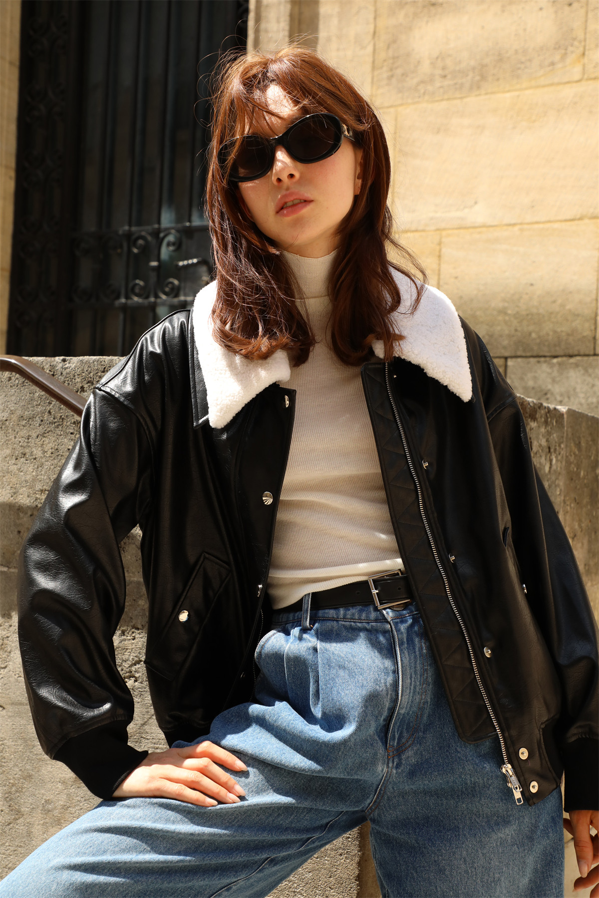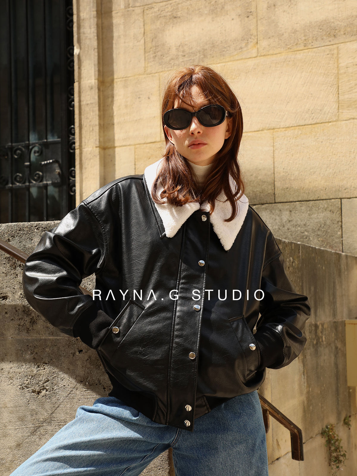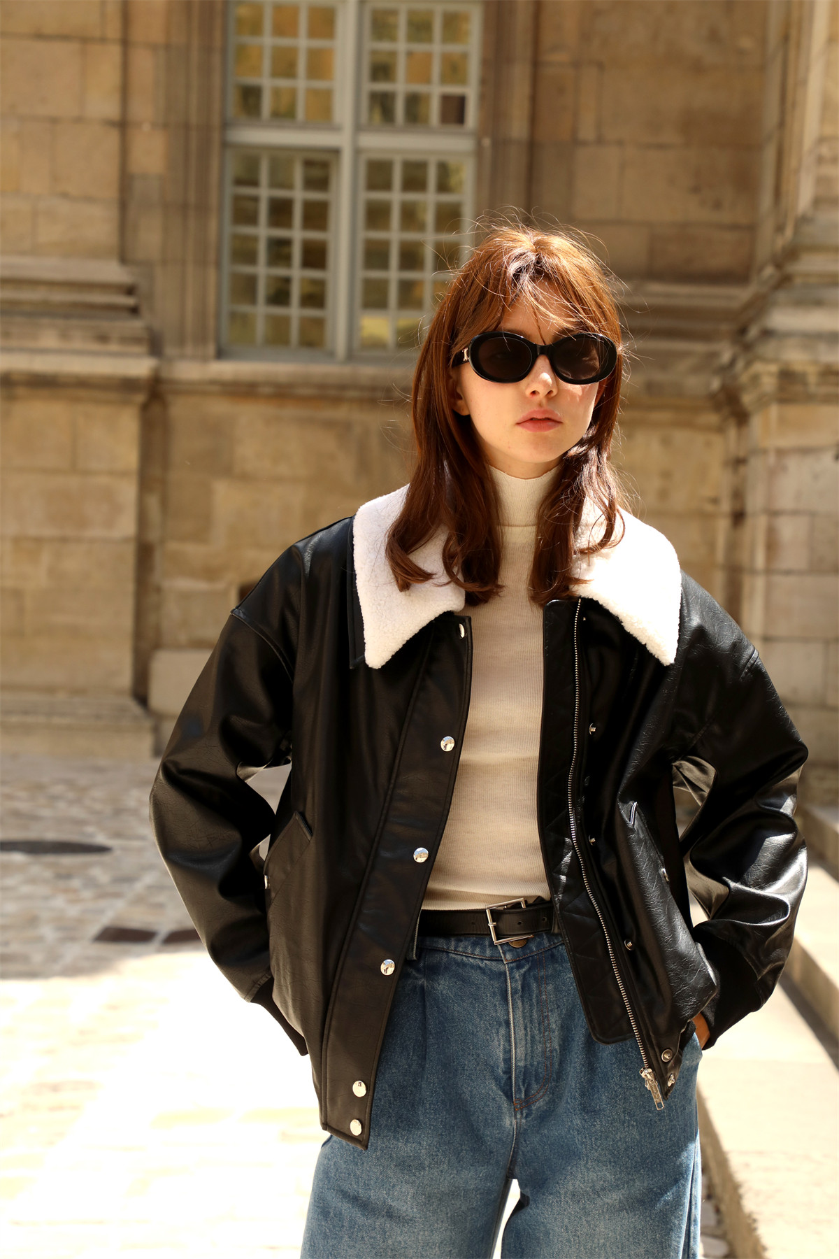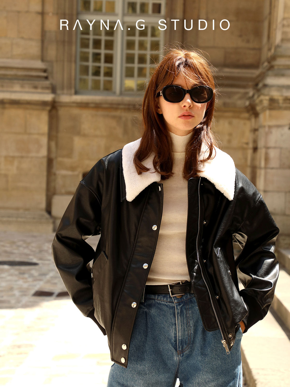 超JI帥氣的皮夾克。也下血本采用了皮毛一體的小羊皮領子,