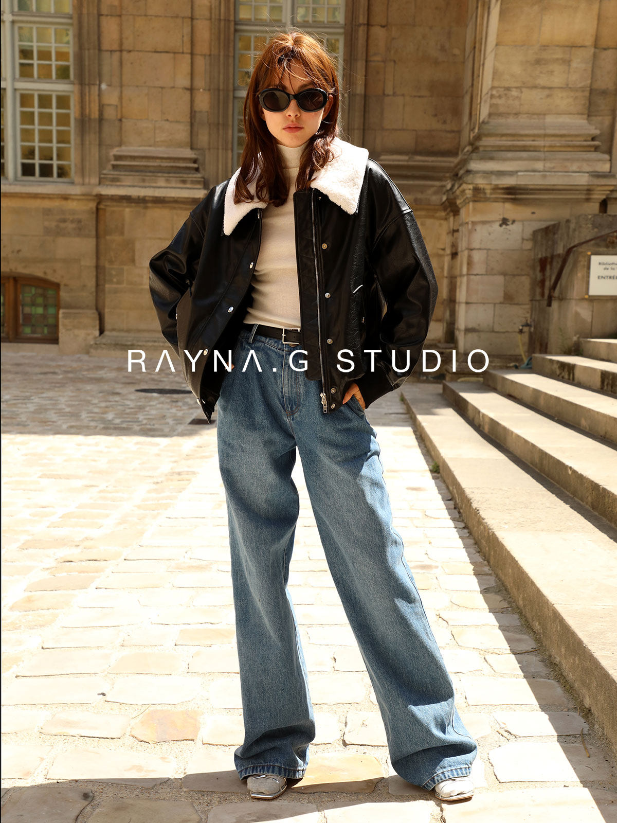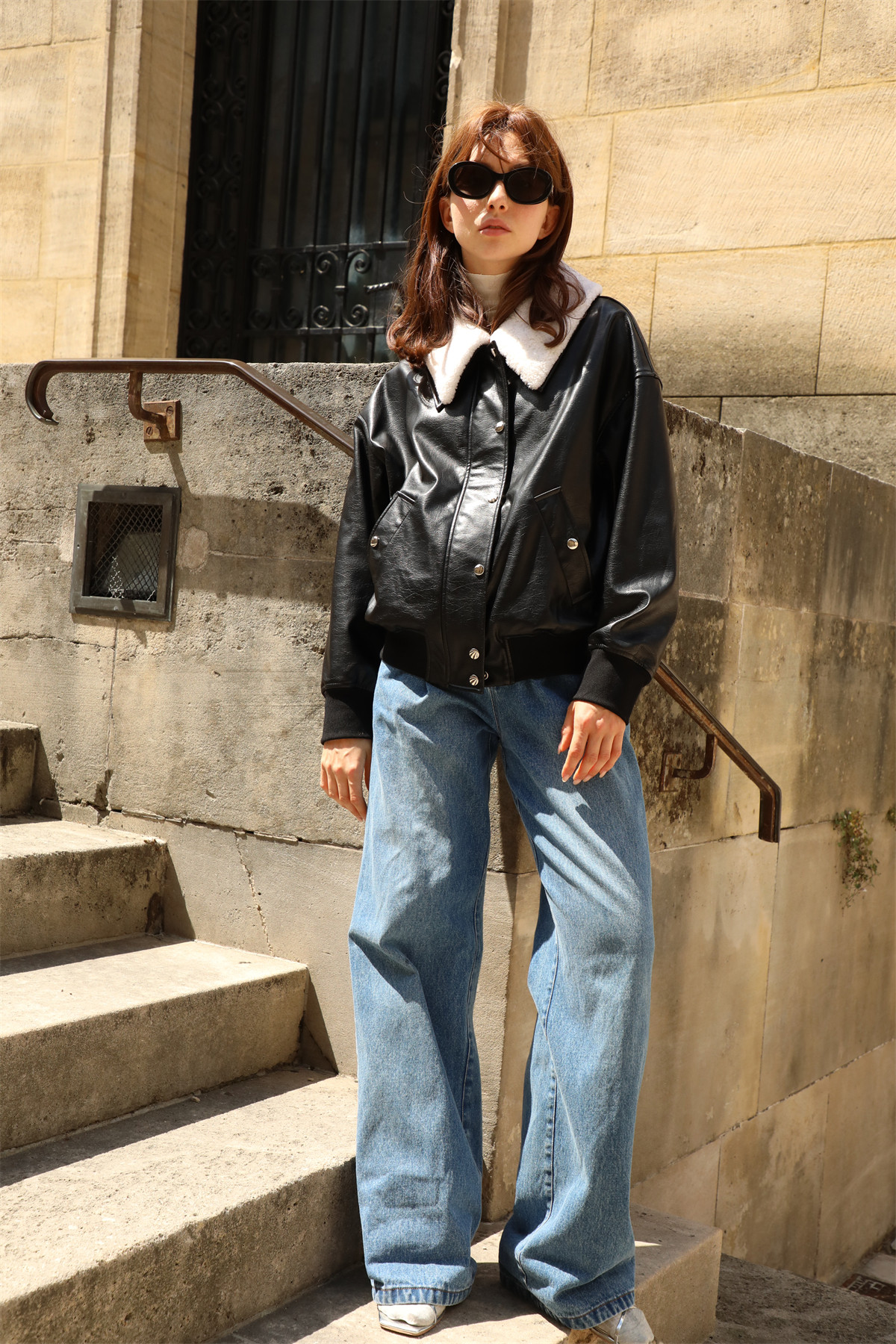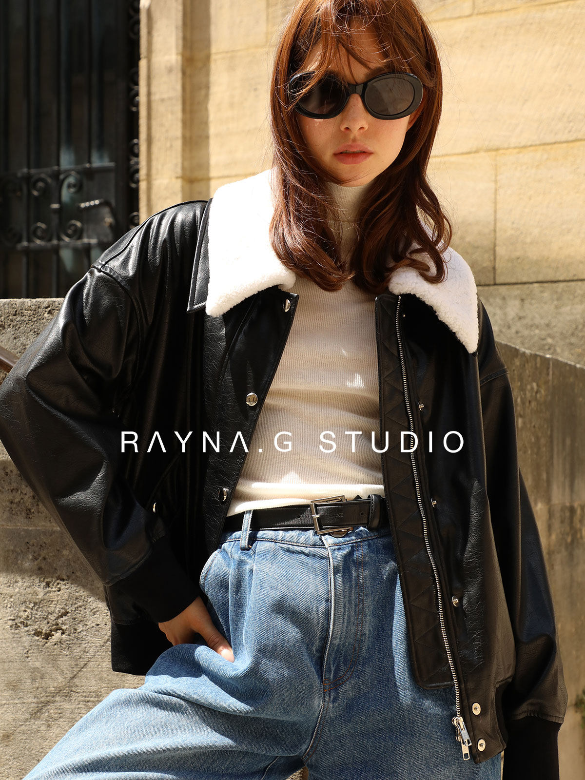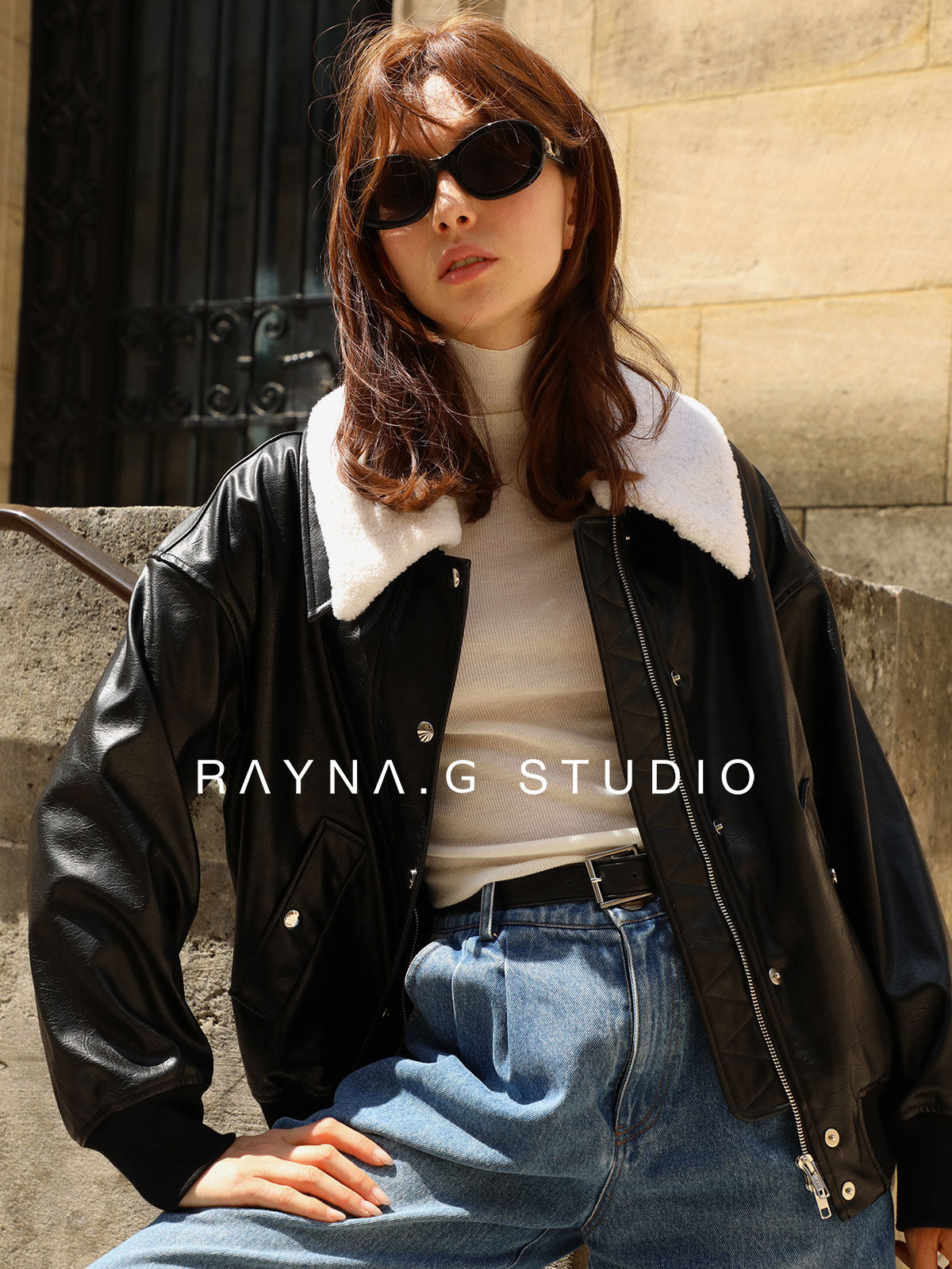 超JI帥氣的皮夾克。也下血本采用了皮毛一體的小羊皮領子,