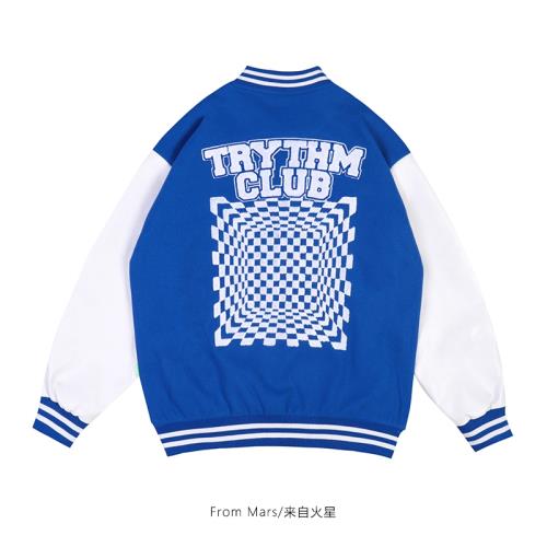 From Mars方格陣型 美式復古街頭撞色克萊因藍寬松bf棒球棉服外套