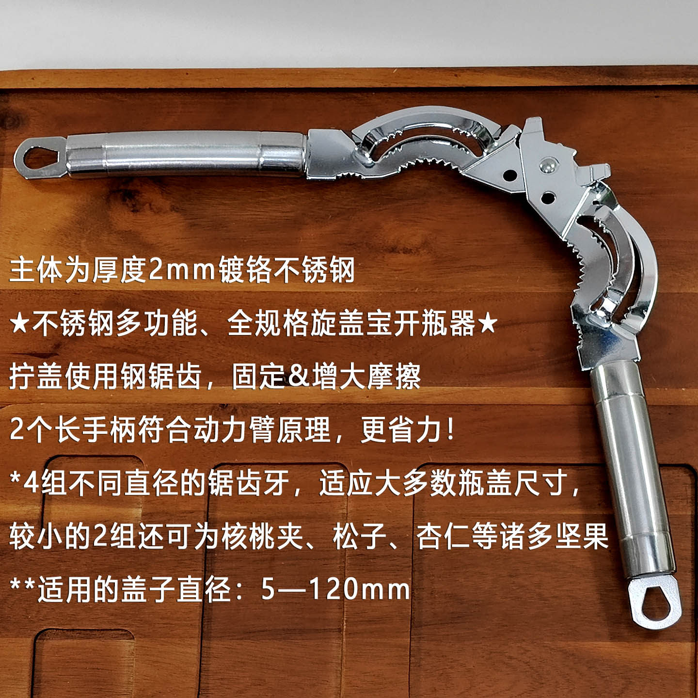 *4個不同直徑的鋸齒牙,開合適應大多數瓶蓋尺寸,較小的2組適合作為核桃夾、夏威夷果、松子、杏仁等諸多堅果