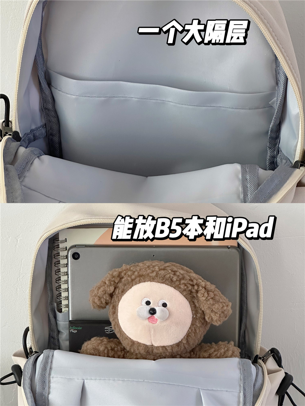 尺寸:能放IPAD,B5本,500ml的水杯