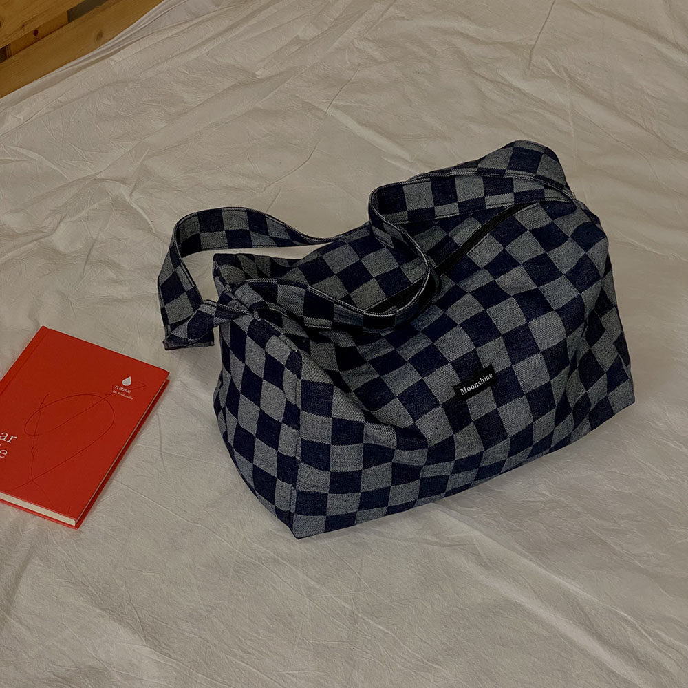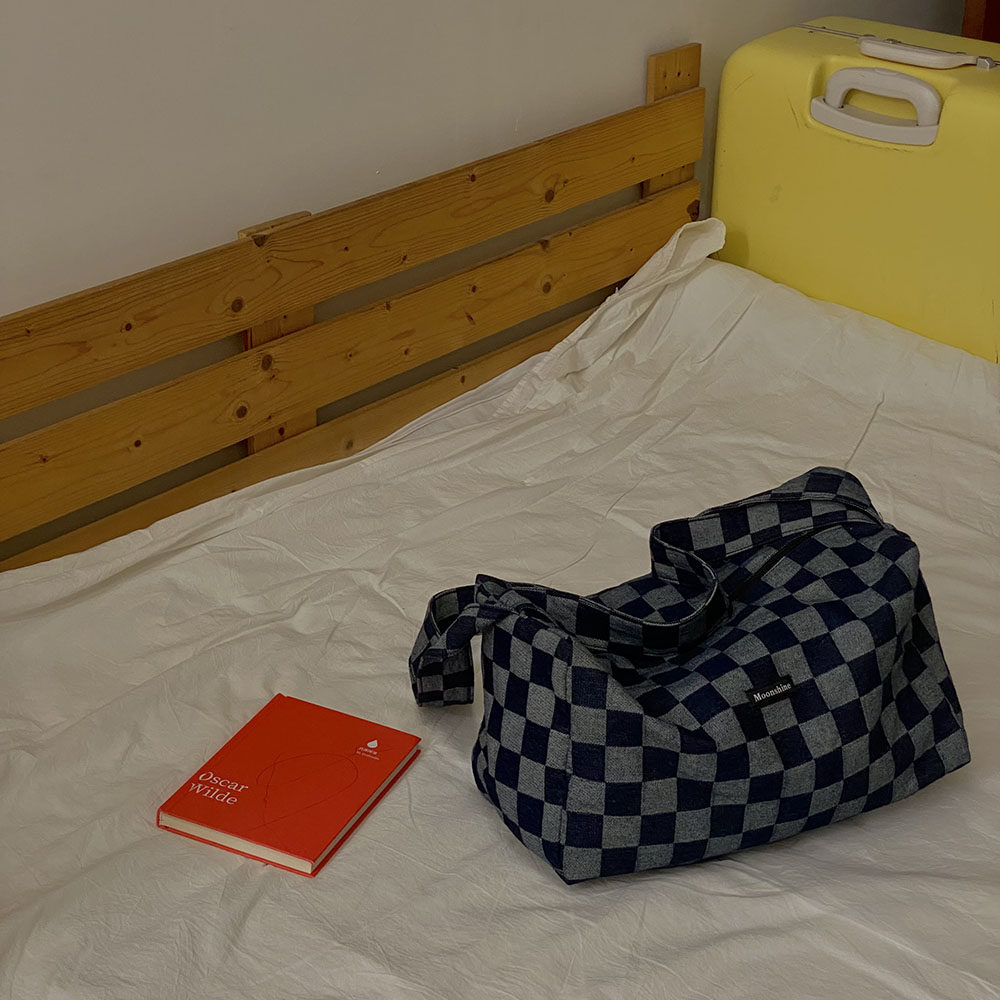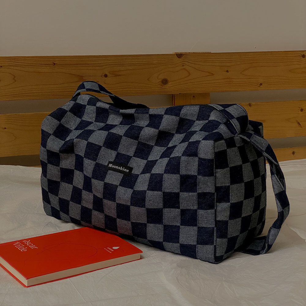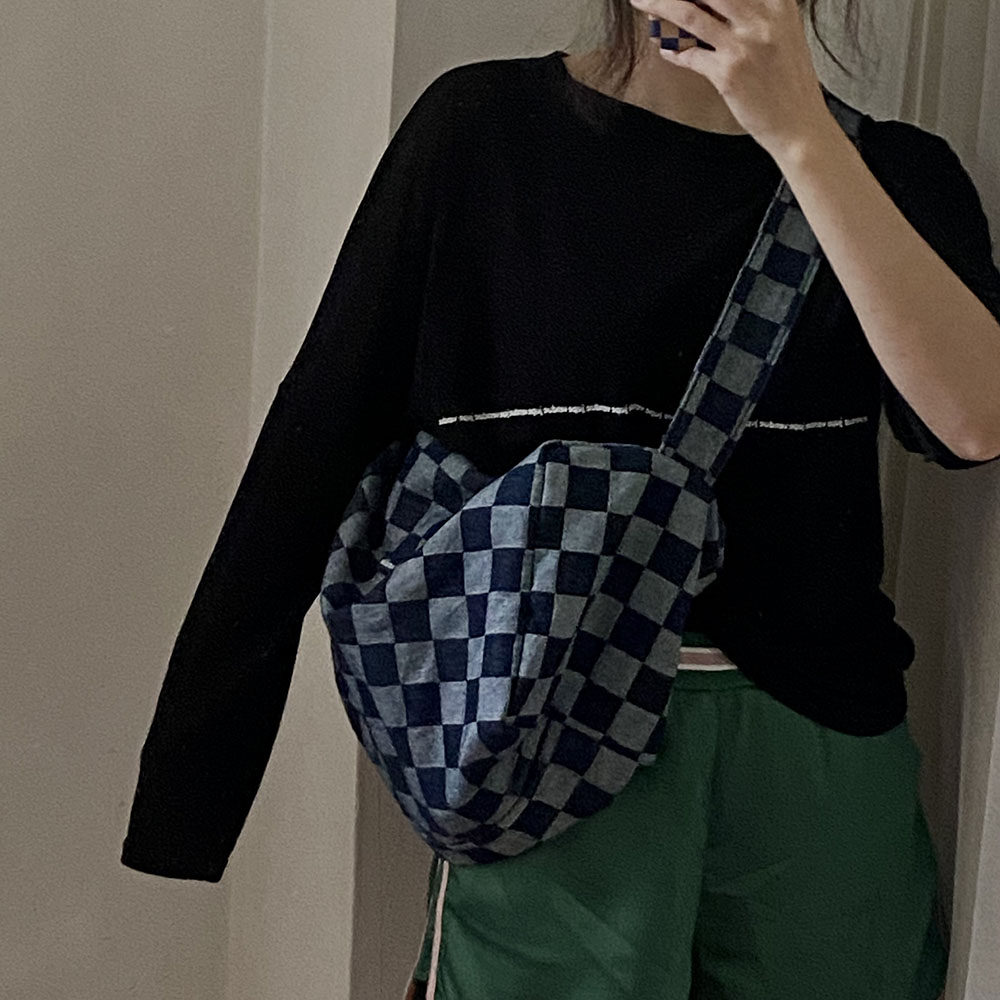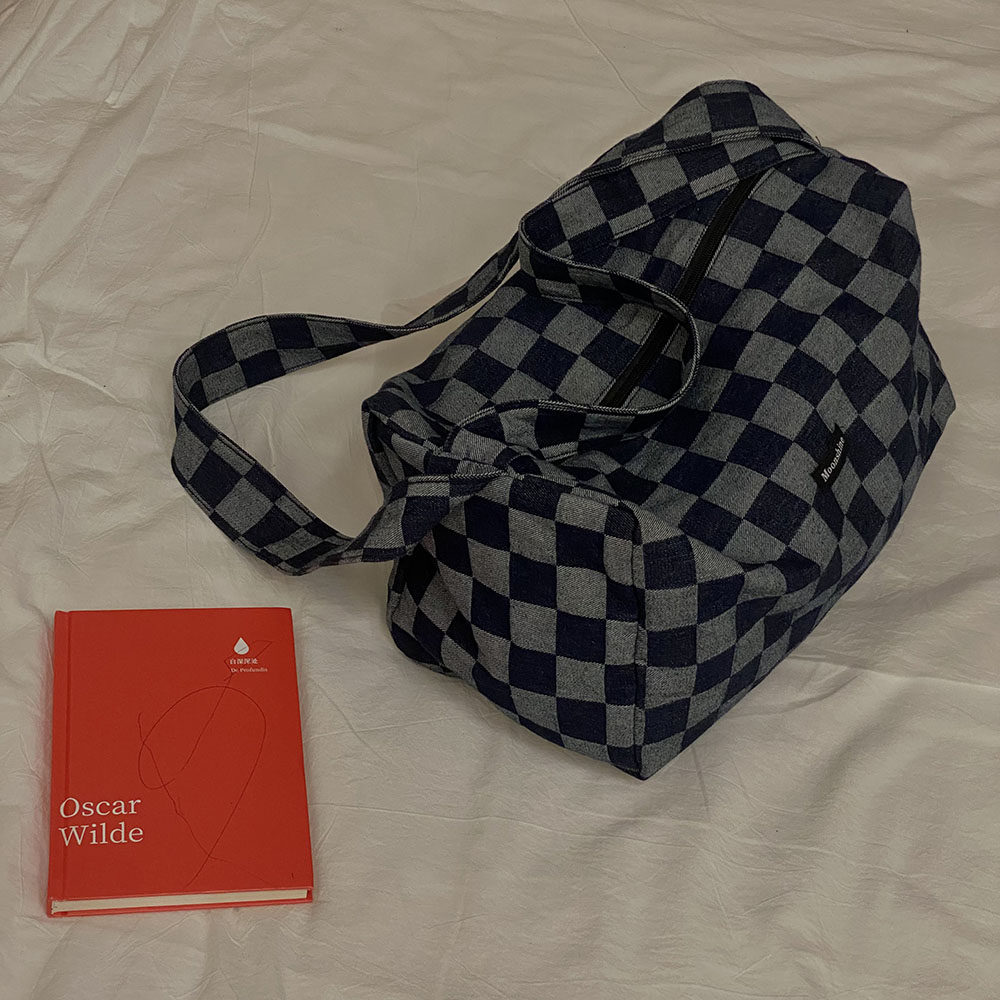 本來因為掉色會增加太多的售后煩惱我們考慮用很淺色的牛仔格子料做大貨,但是效果不及深色好,所以還是做的深色。