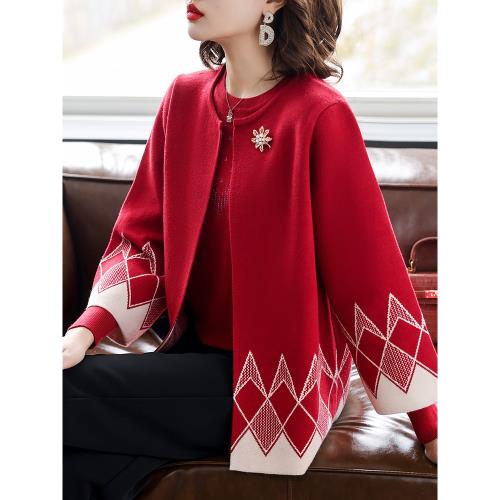 媽媽春秋洋氣針織外套時尚套裝喜婆婆婚宴禮服中老年人上衣兩件套