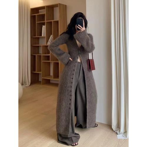 短毛貂絨v領長款開衫外套女中長款顯瘦連衣裙針織修身打底裙外套