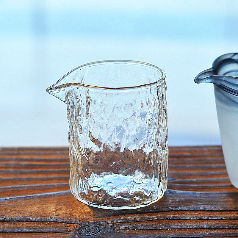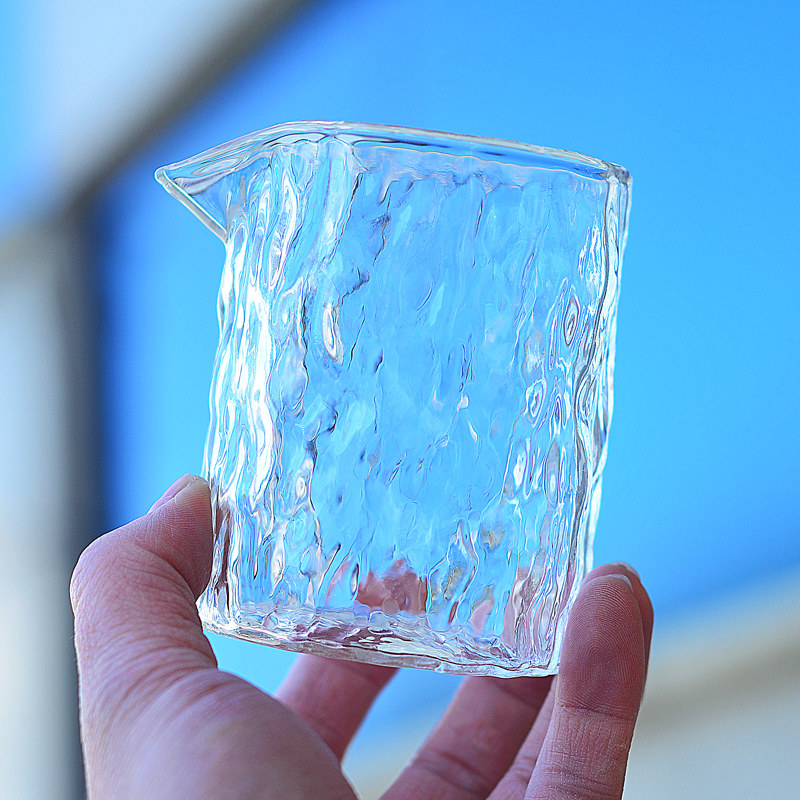 主圖款錘紋公道杯材質高硼硅玻璃,容量約260毫升,高度約9.5cm,口徑約7.1cm。