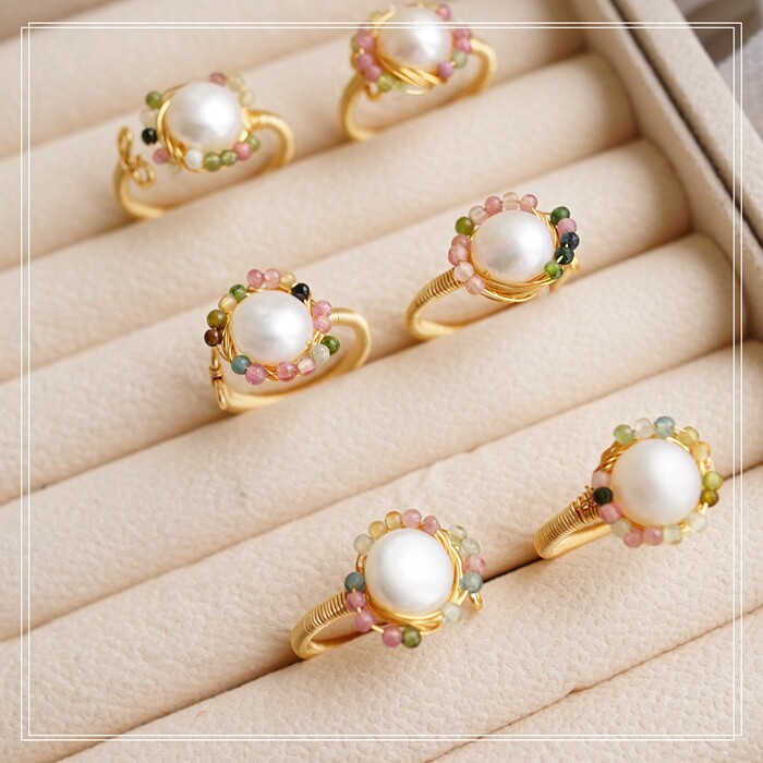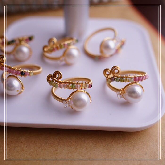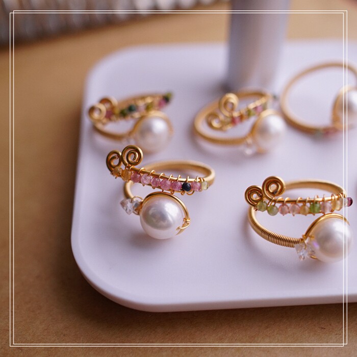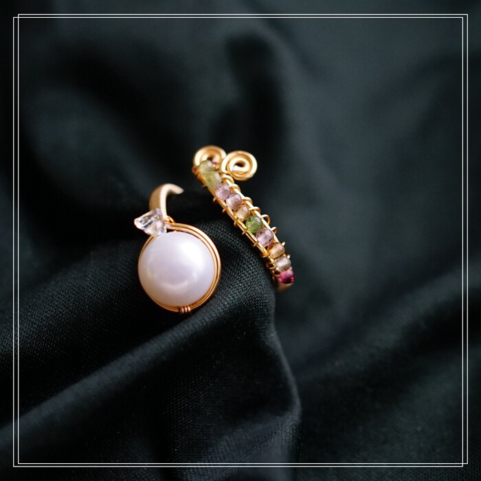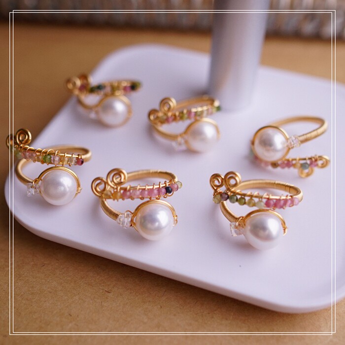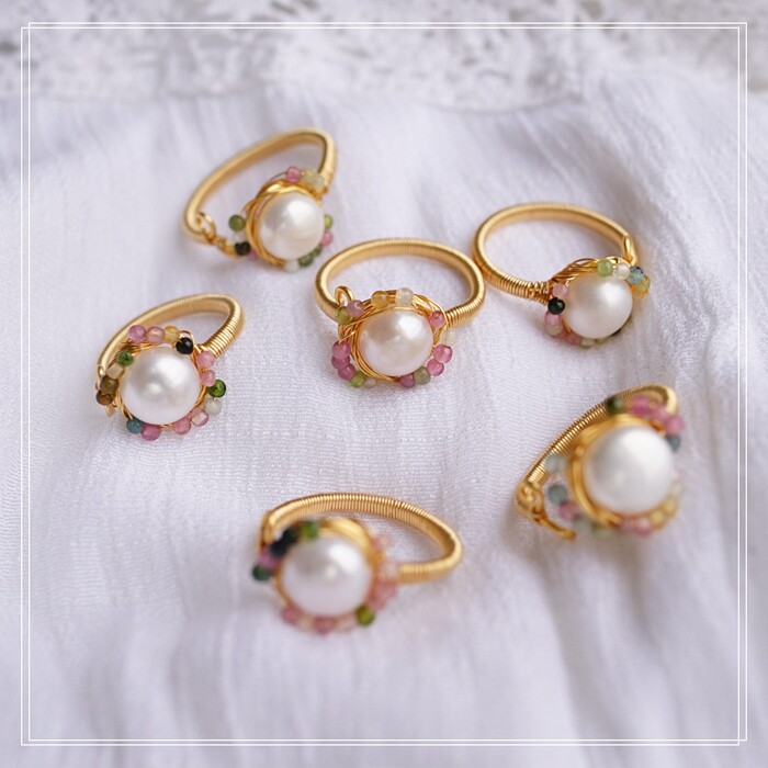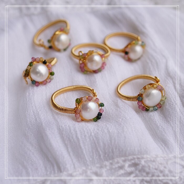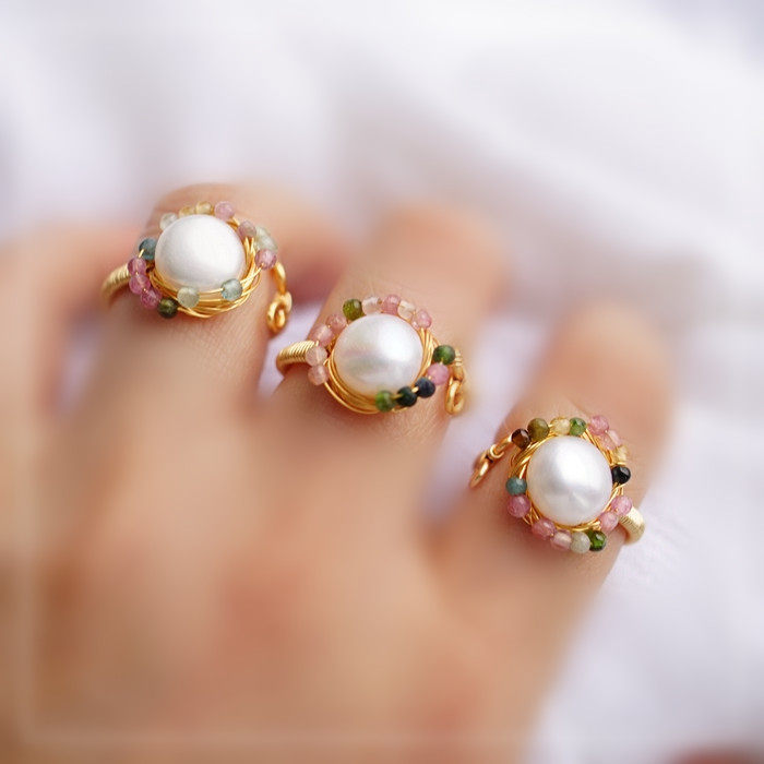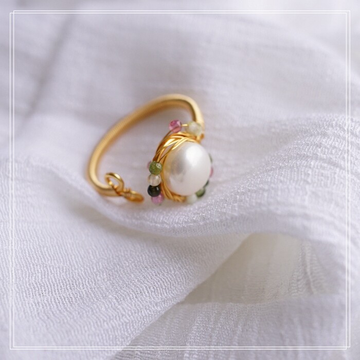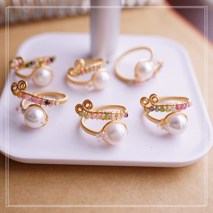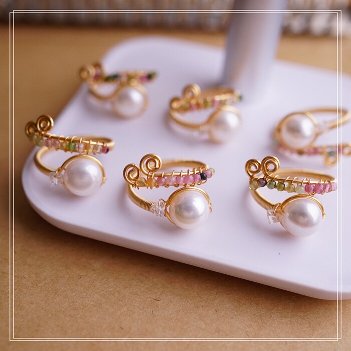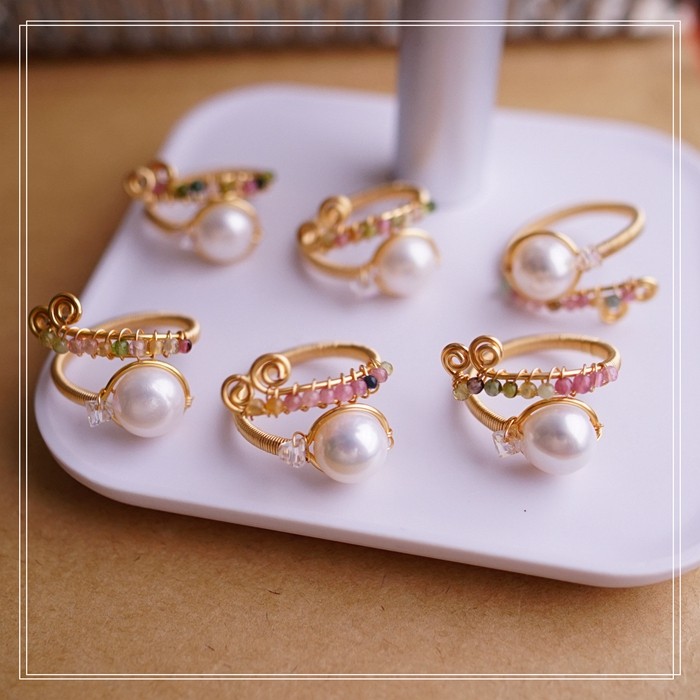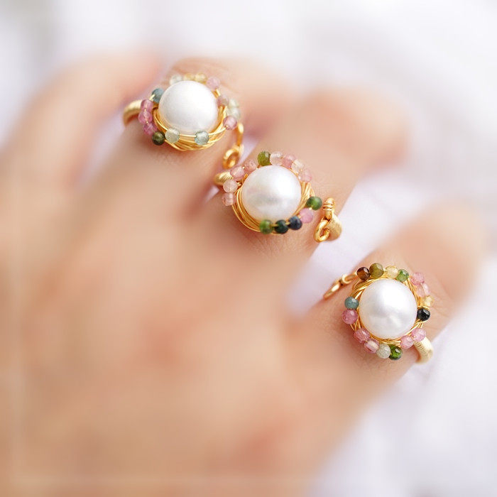 全部手工制作的14K戒指繞線纏繞 淡水珍珠珍珠蜜蠟碧璽等天然寶石