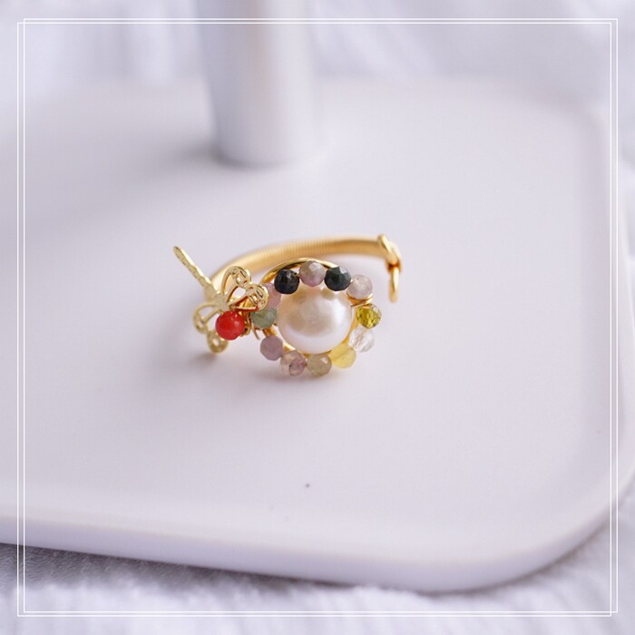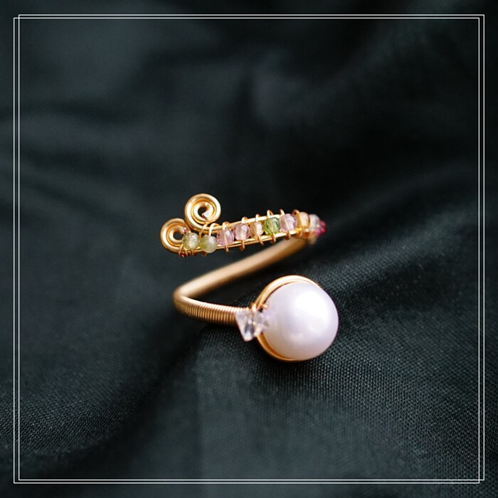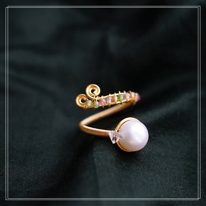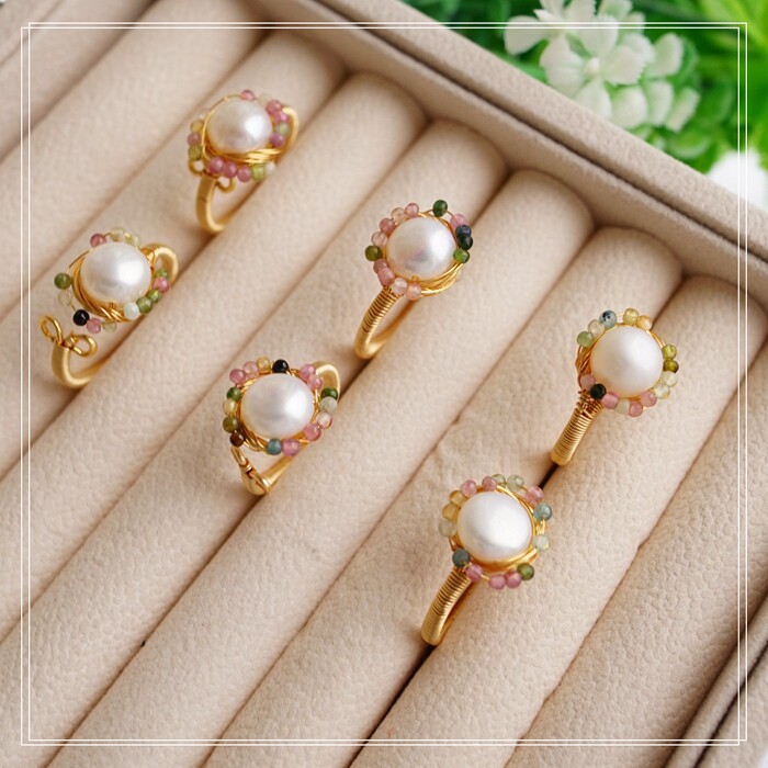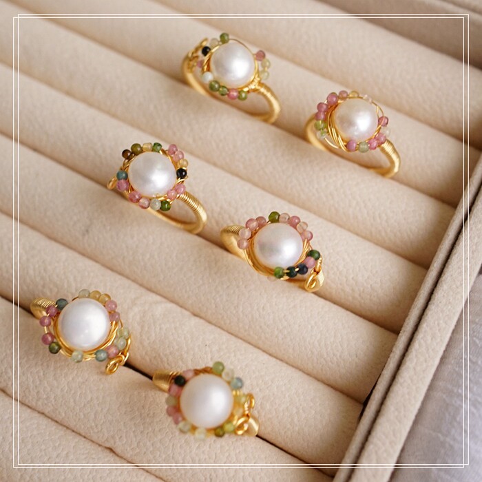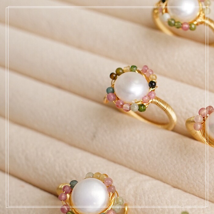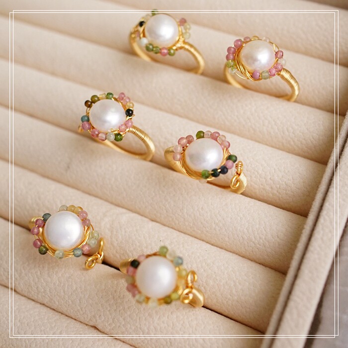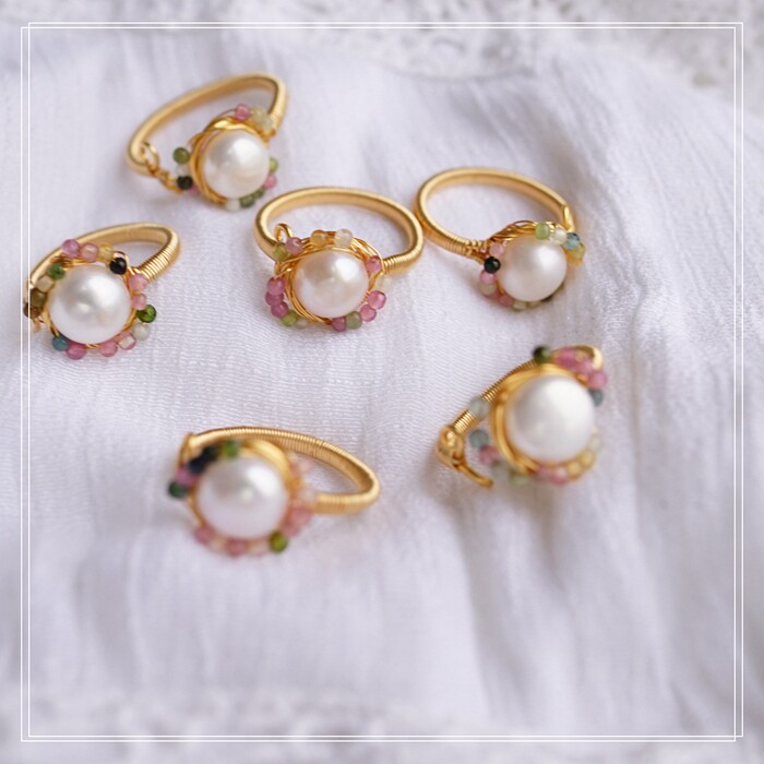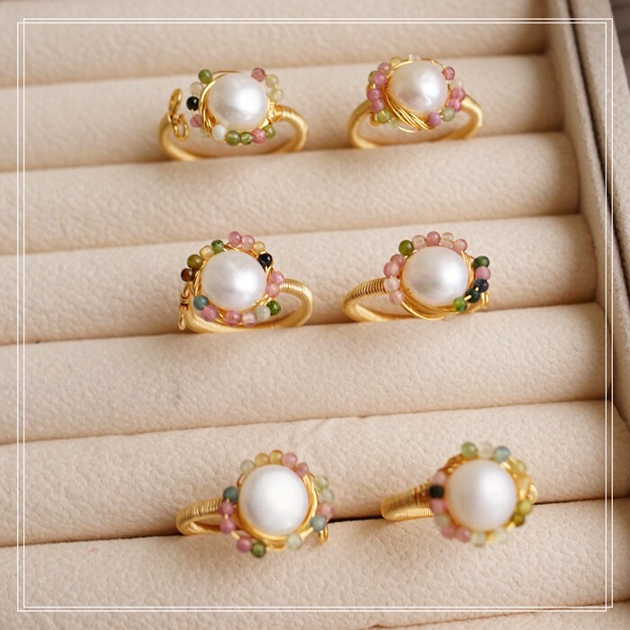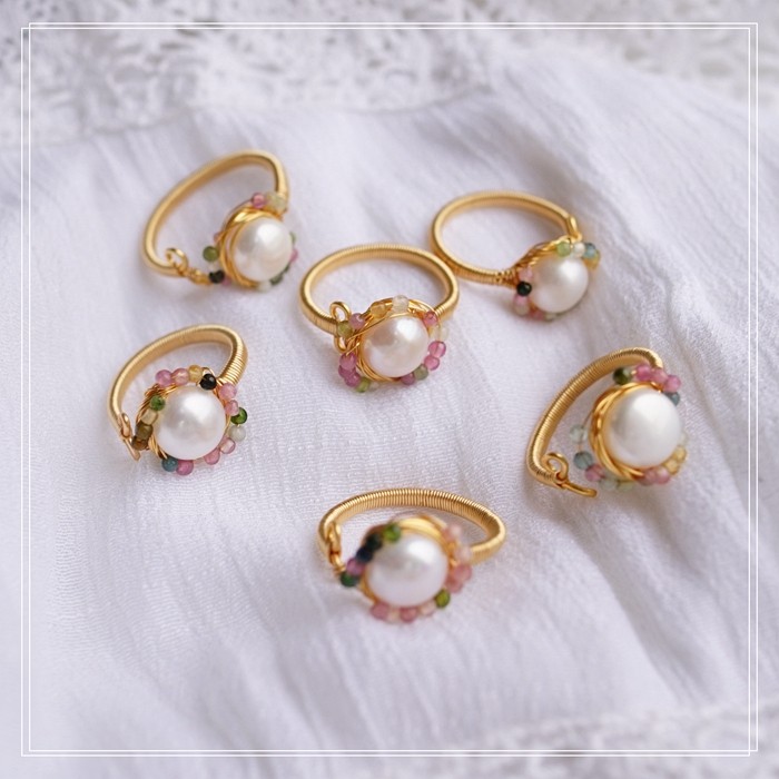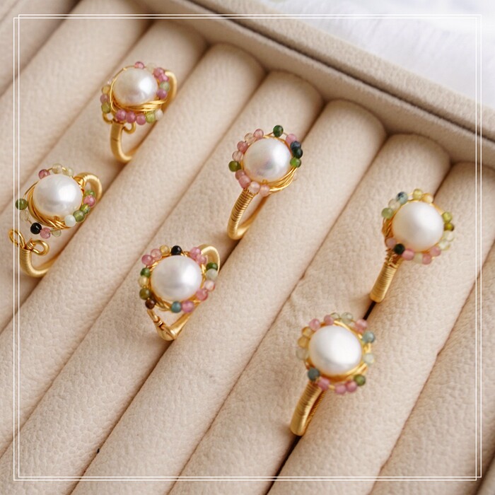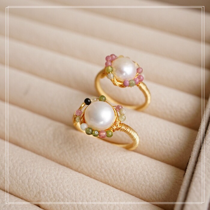 全部手工制作的14K戒指繞線纏繞 淡水珍珠珍珠蜜蠟碧璽等天然寶石