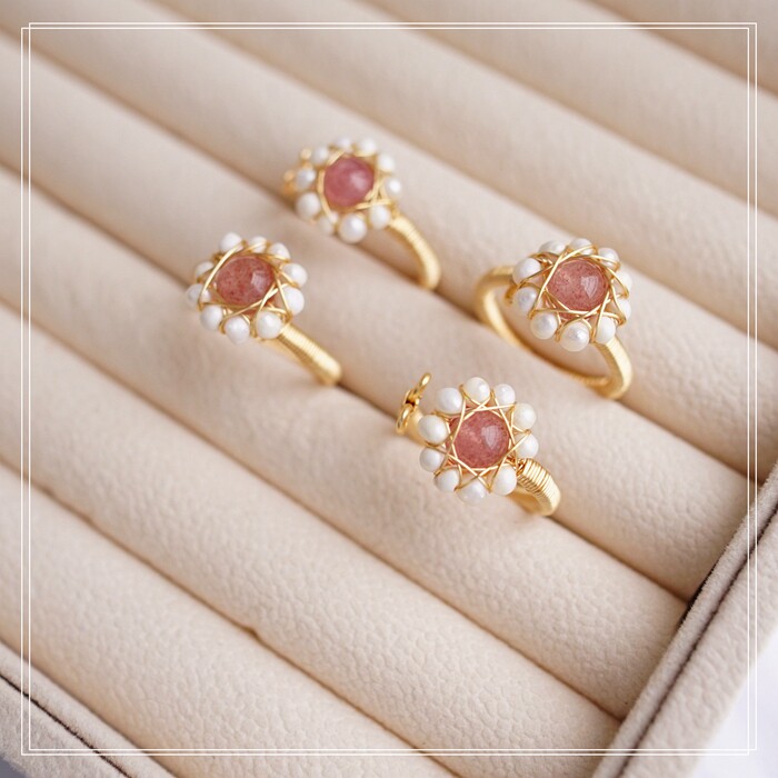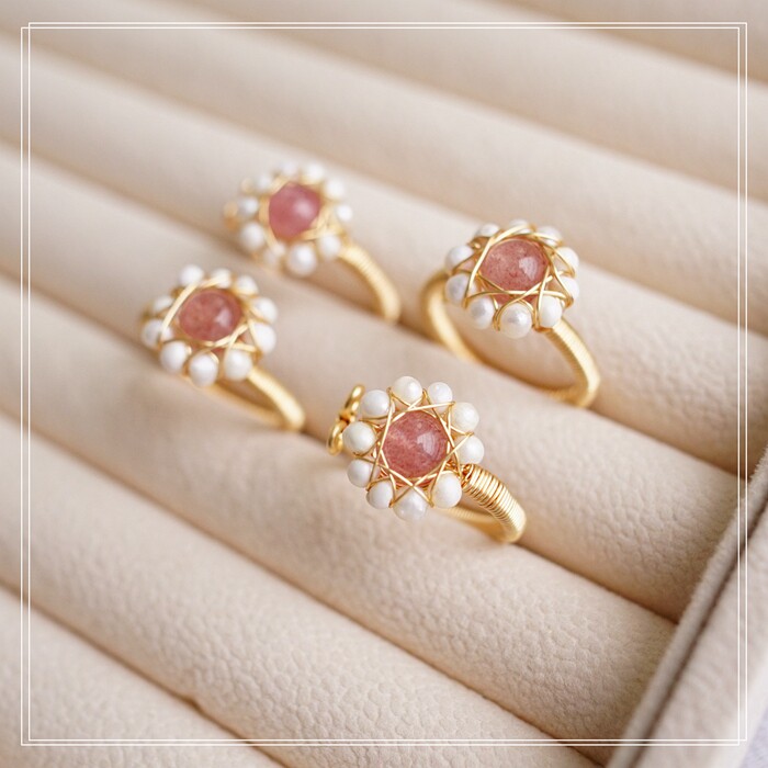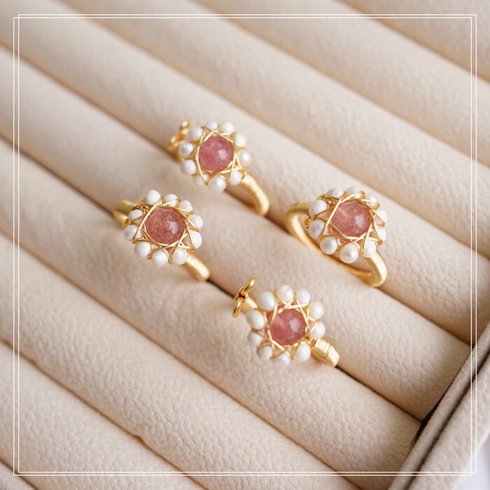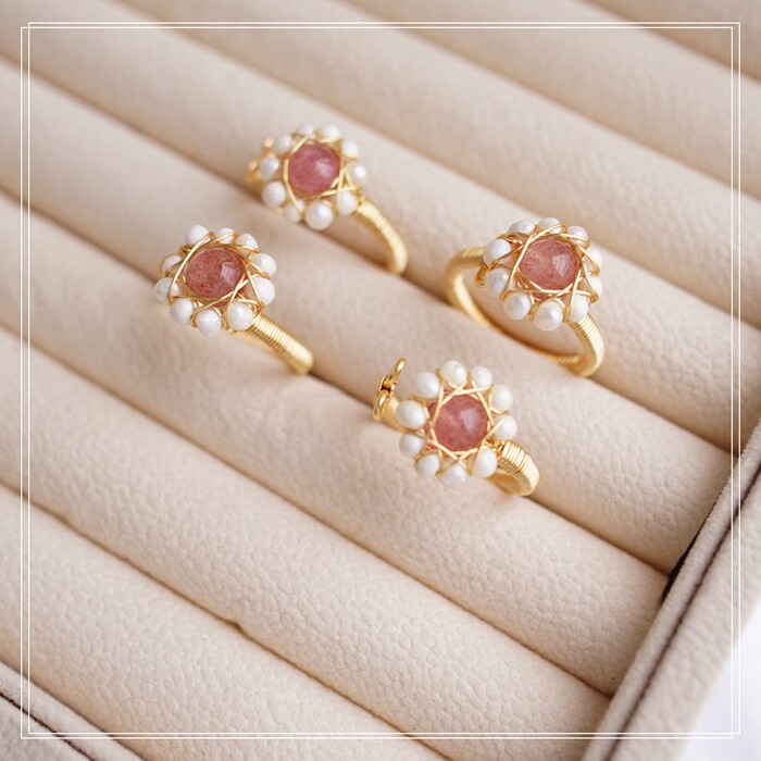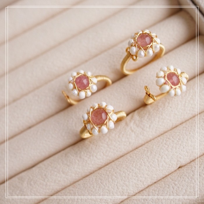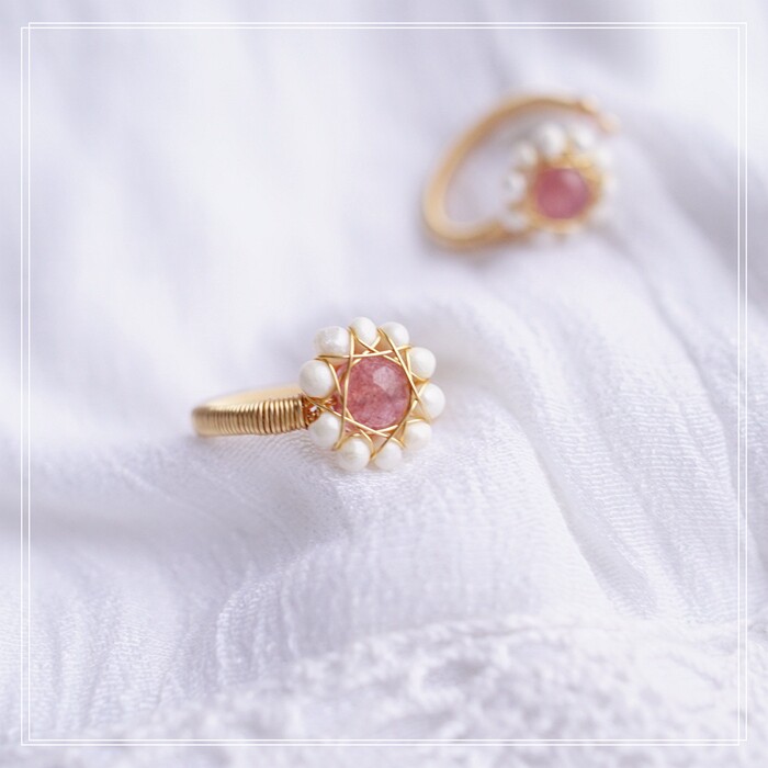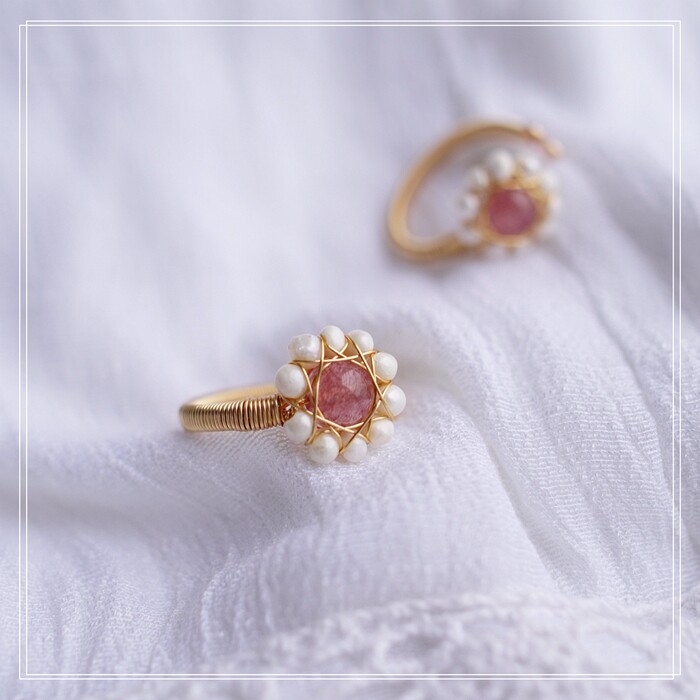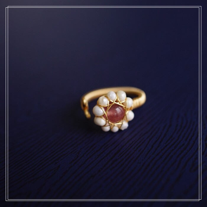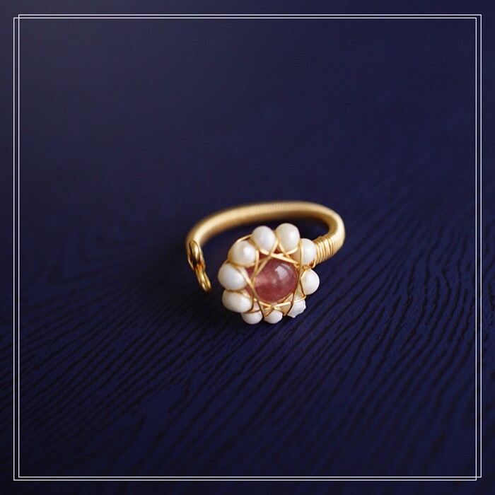 132#淡水珍珠+草莓晶開口戒指(戒面1.3CM)