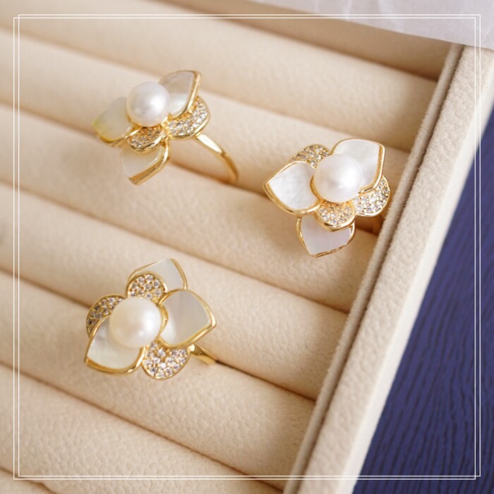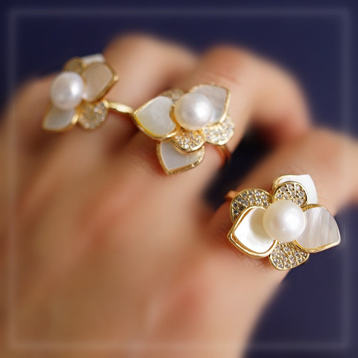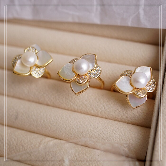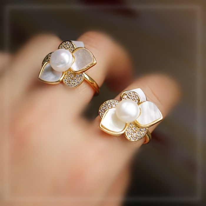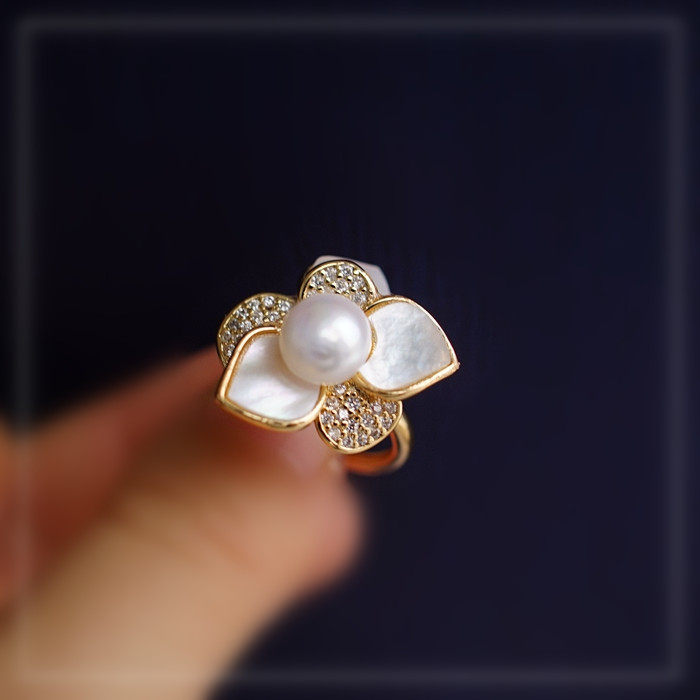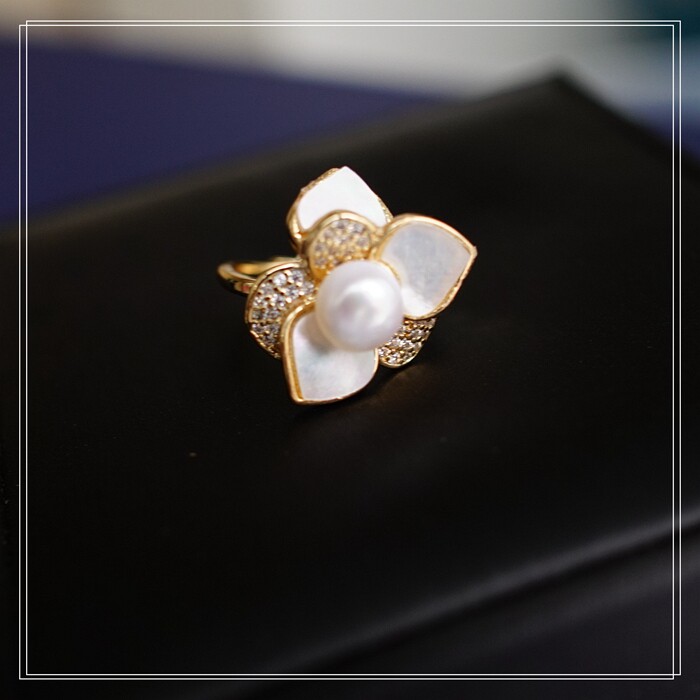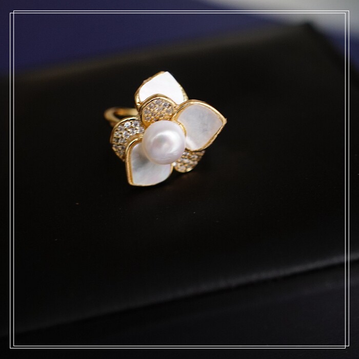 123#淡水珍珠+ 貝殼滿鉆微鑲活口戒指(戒面2CM)
