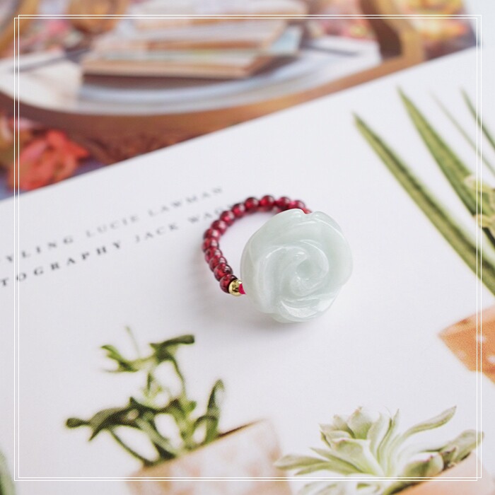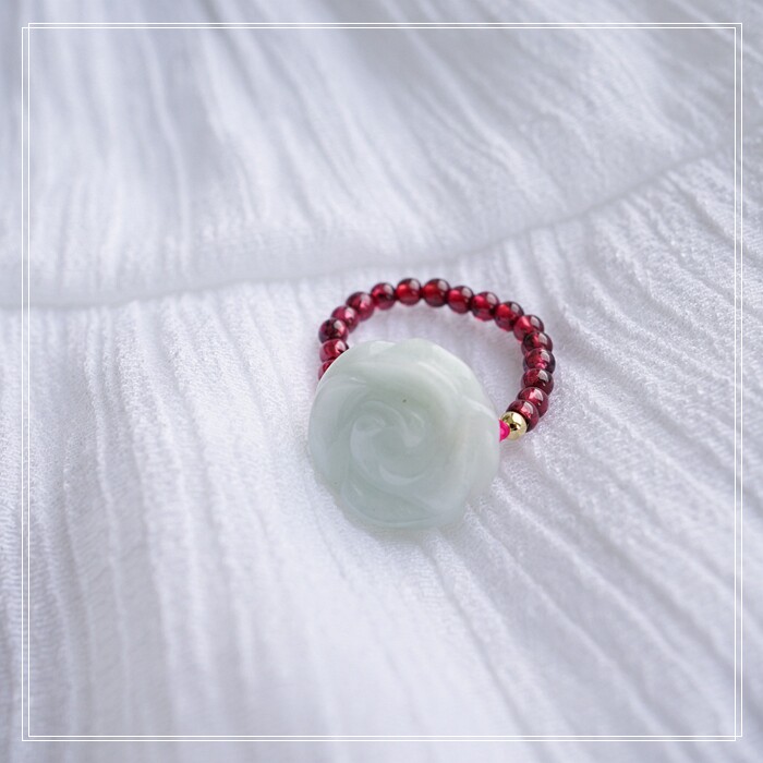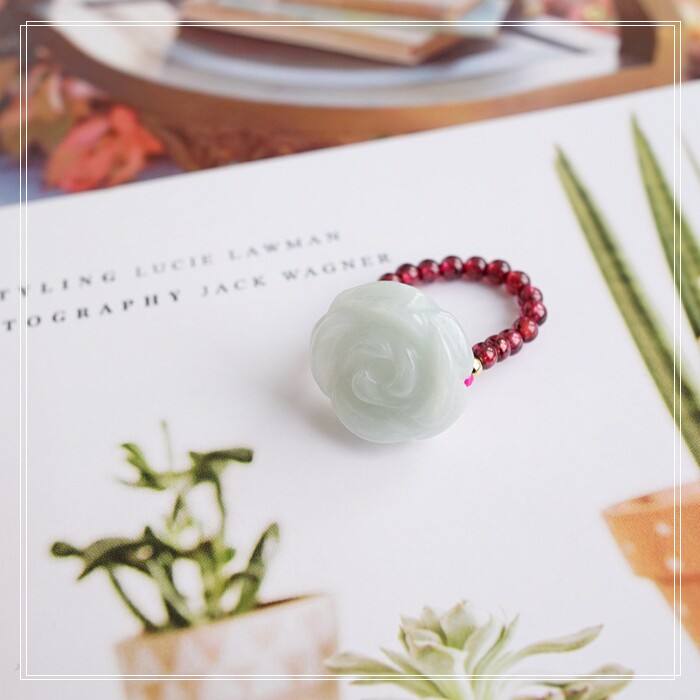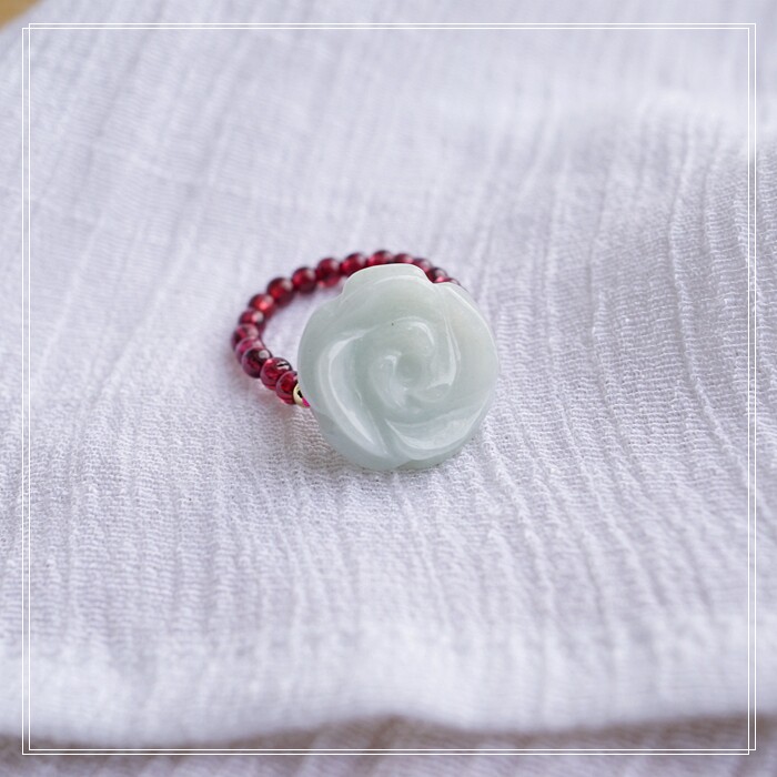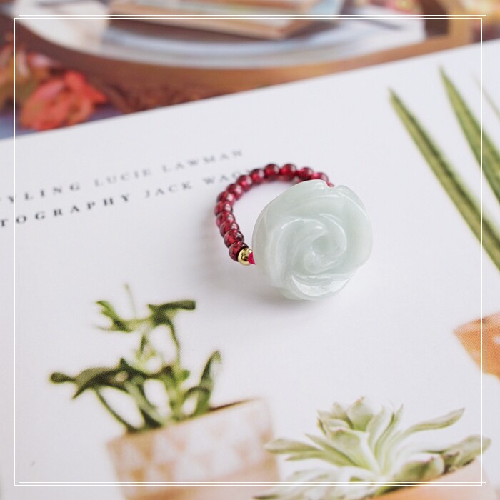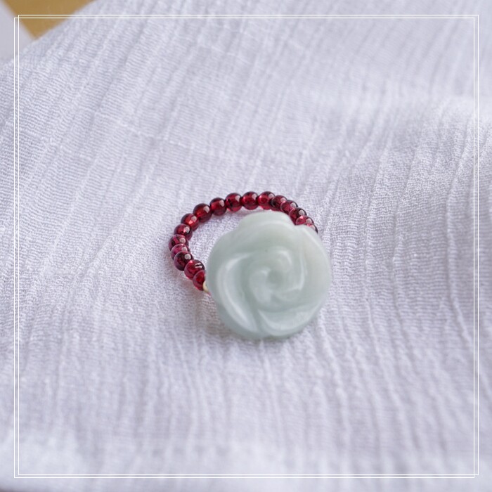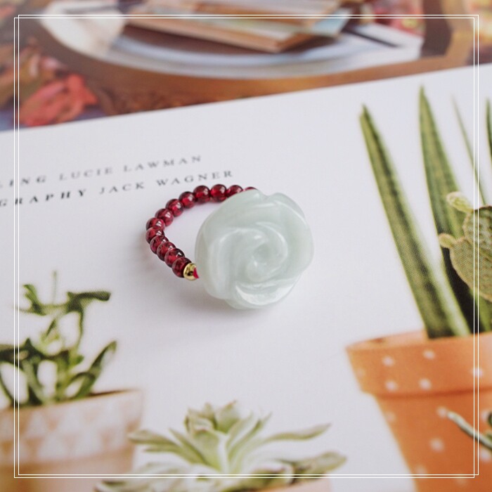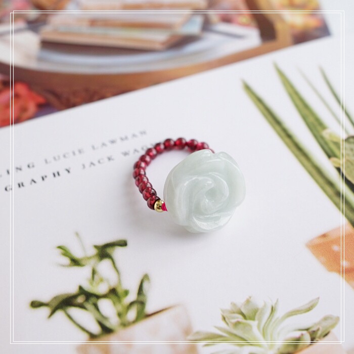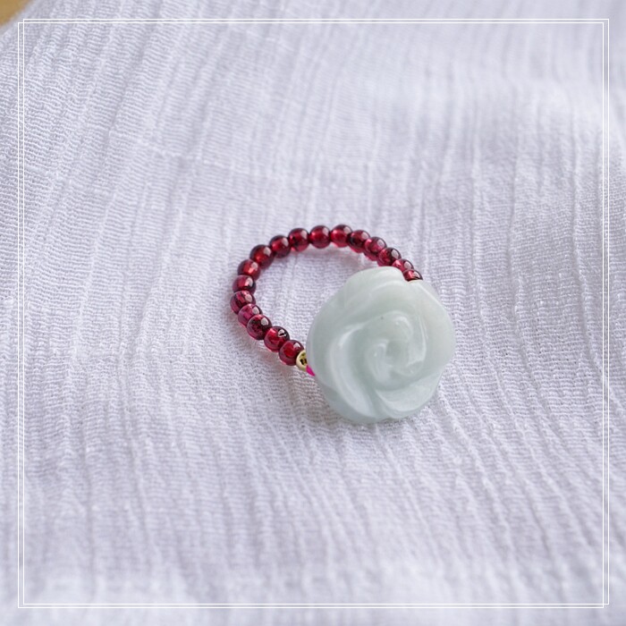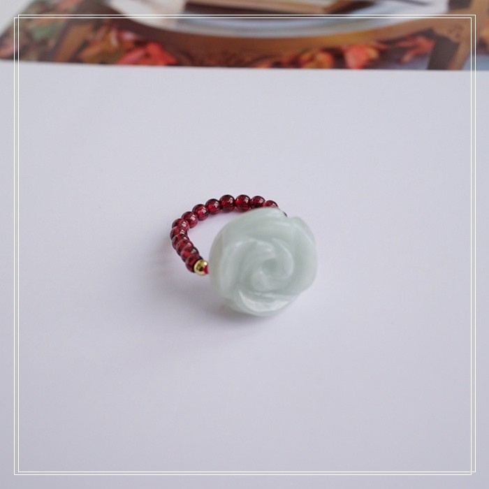 102#翡翠石榴石彈力繩戒指 玫瑰花1.5CM 石榴石0.2-0.3CM