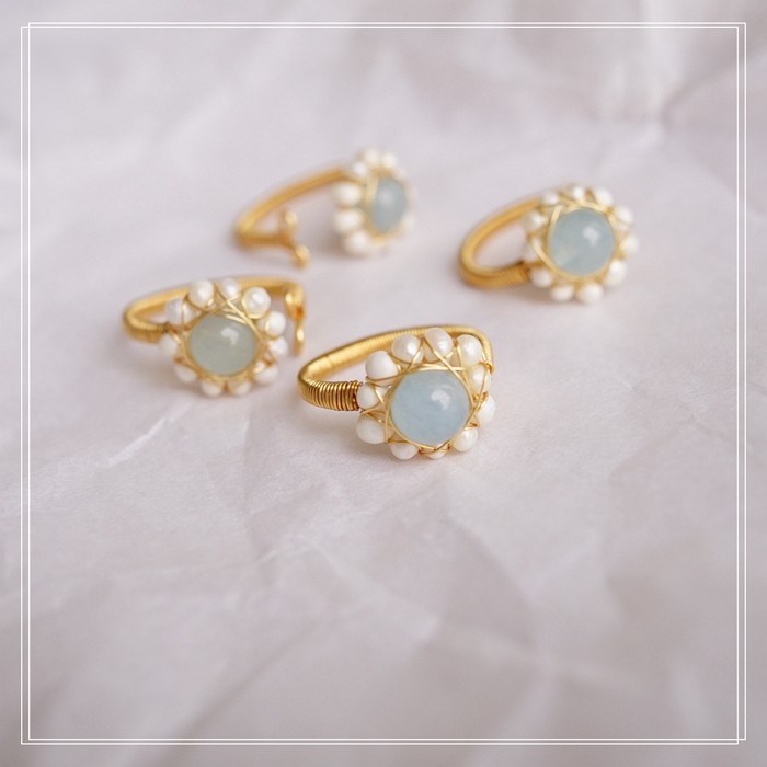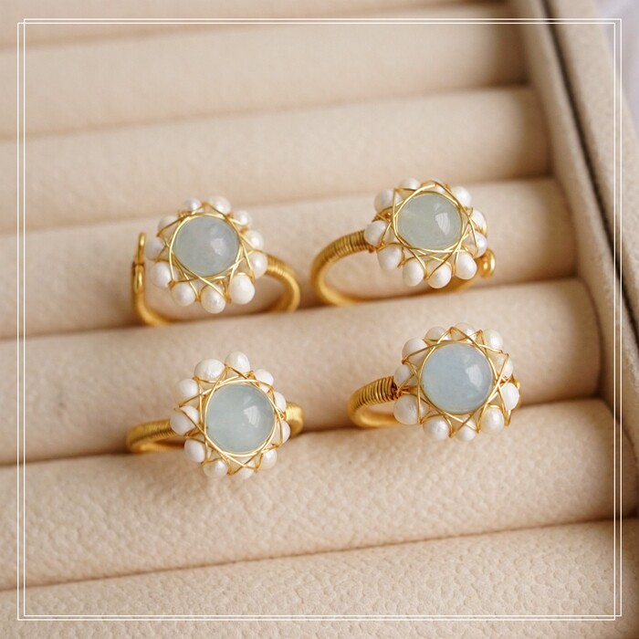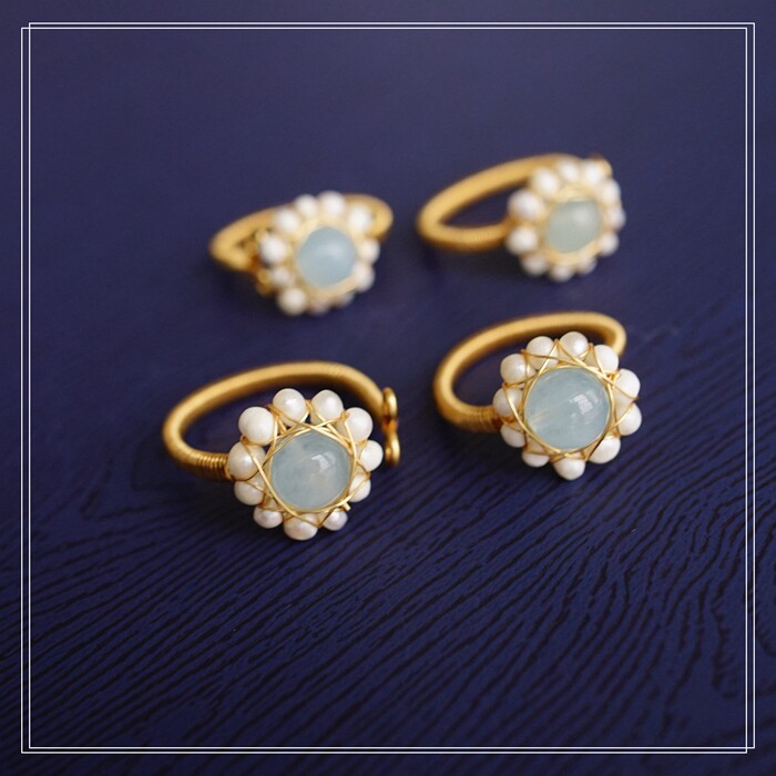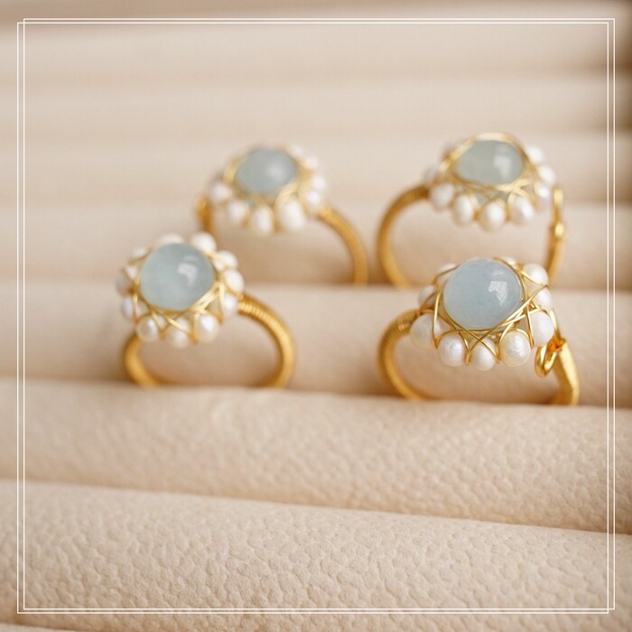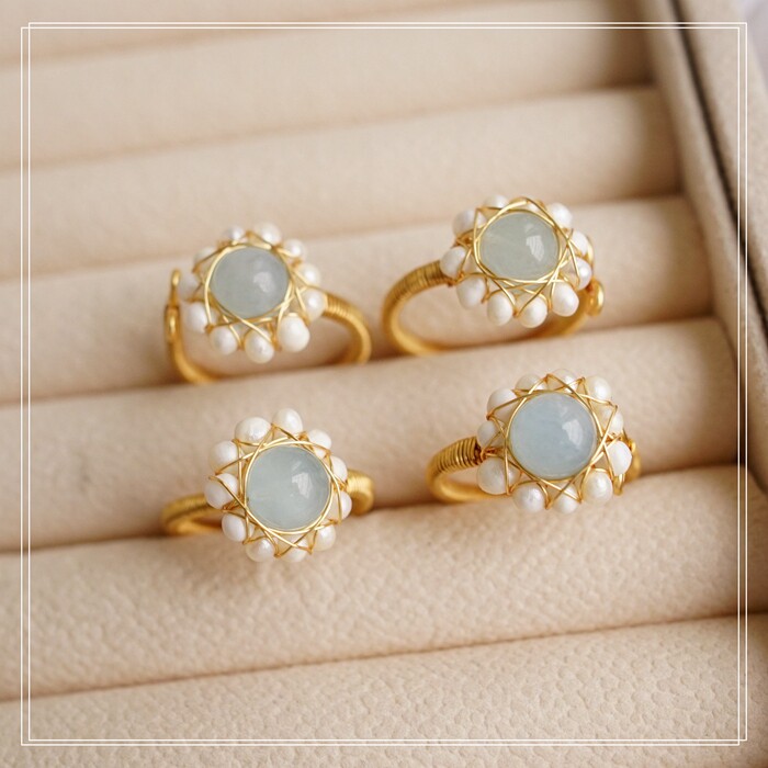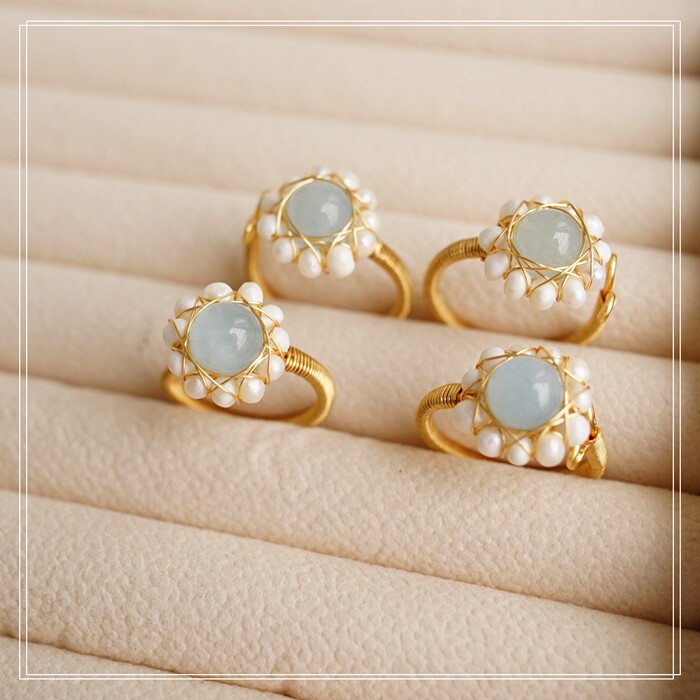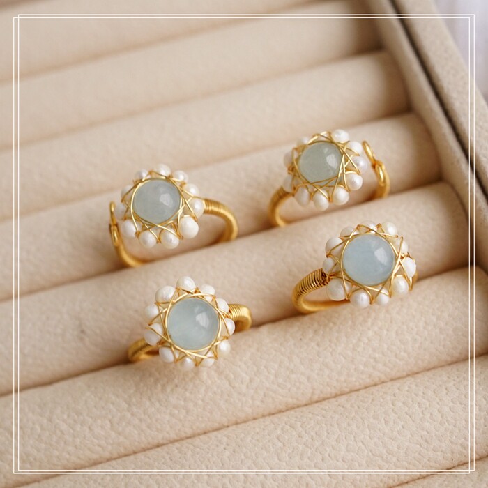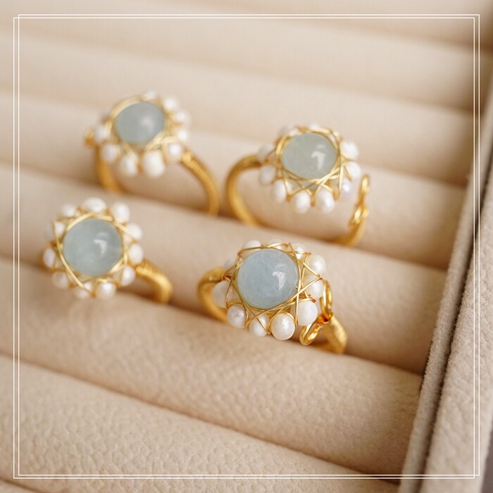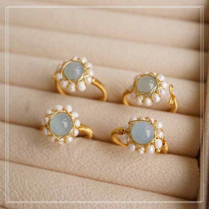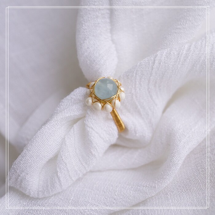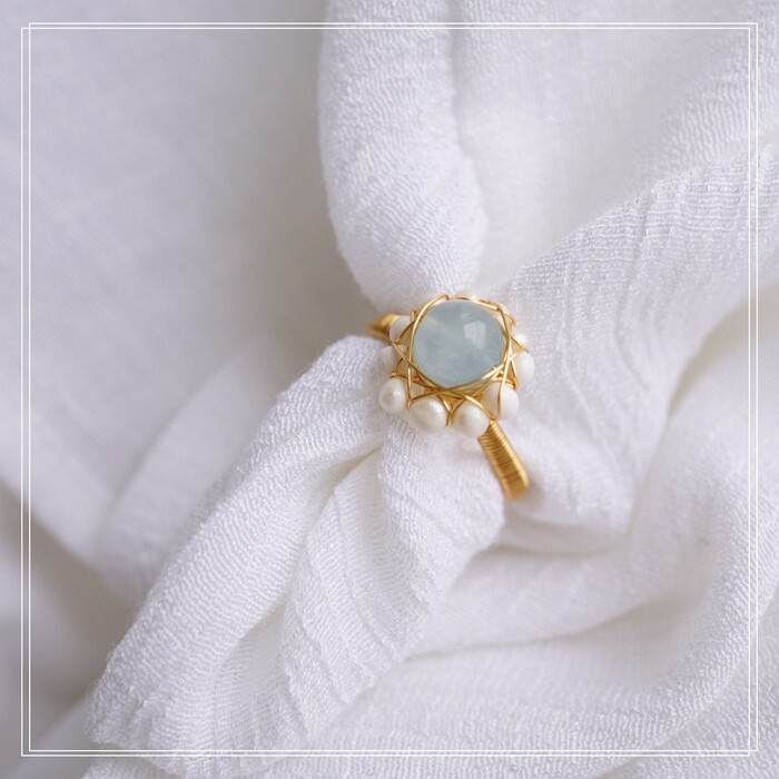 122#淡水珍珠海藍玉開口戒指(戒面1.5CM)