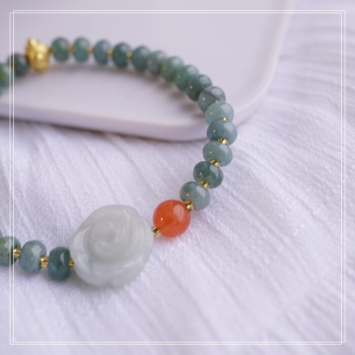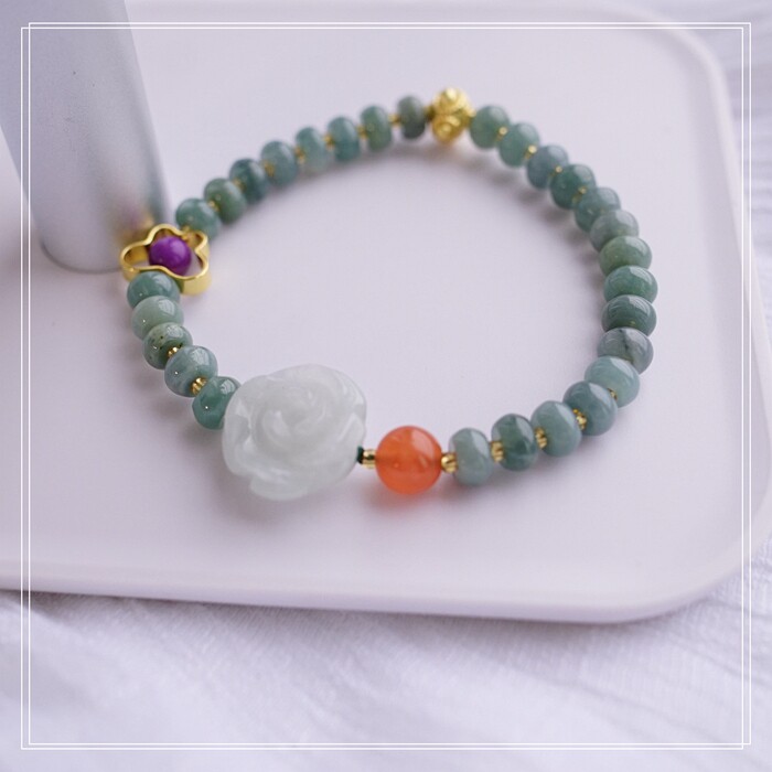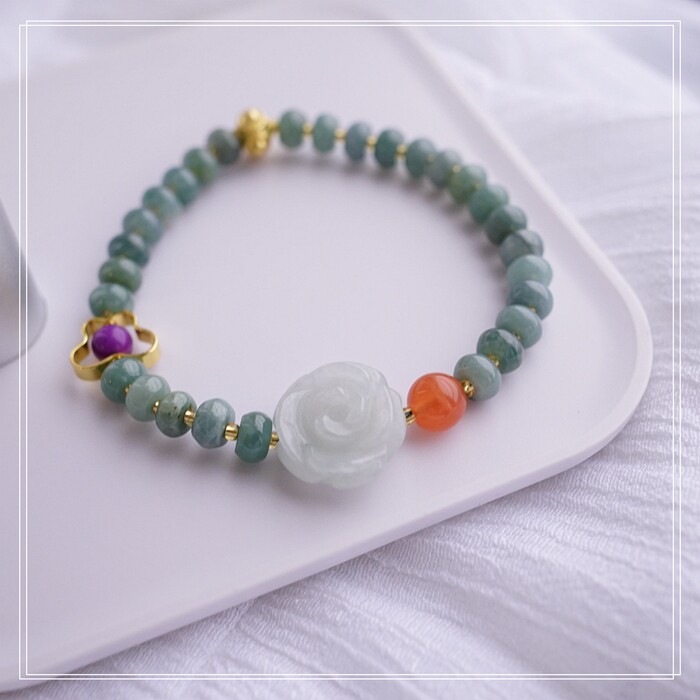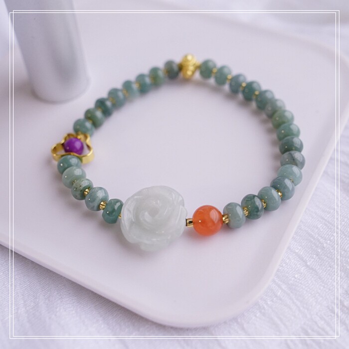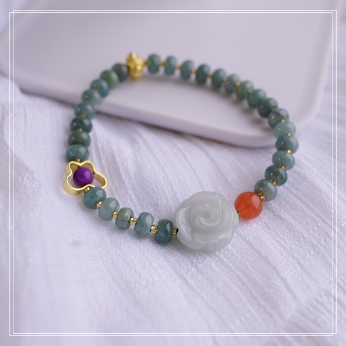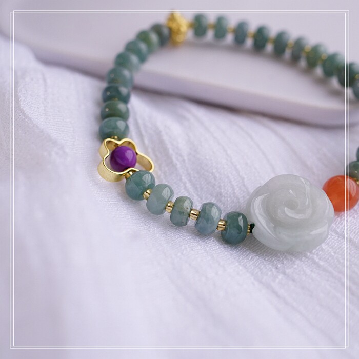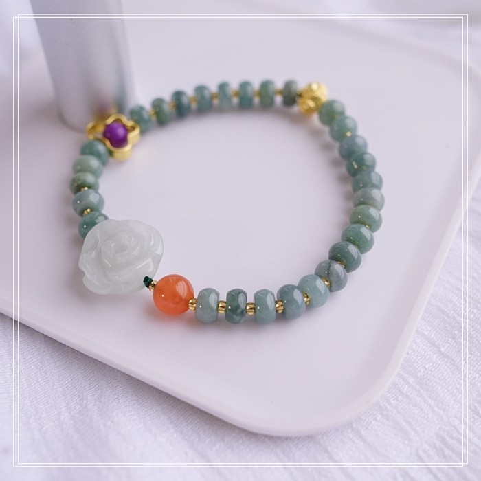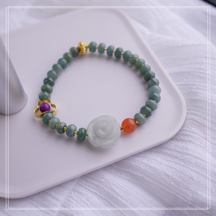 55#藍水翡翠手鏈 寬0.6CM 玫瑰花雕刻1.5CM 南紅瑪瑙紫玉