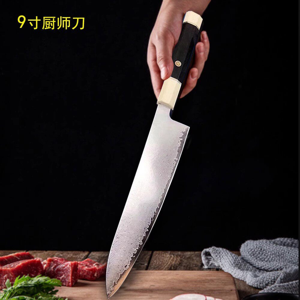 【大馬士革牛刀】做工品質非常不錯,刀刃選用大馬士革VG10鋼,表面花紋浪花跡紋理、主要特點鋒利為主,全手工蛤刃式打磨開鋒、粗煅到細磨,輕松做到單手斷頭發家用切菜等肉片更加輕松。