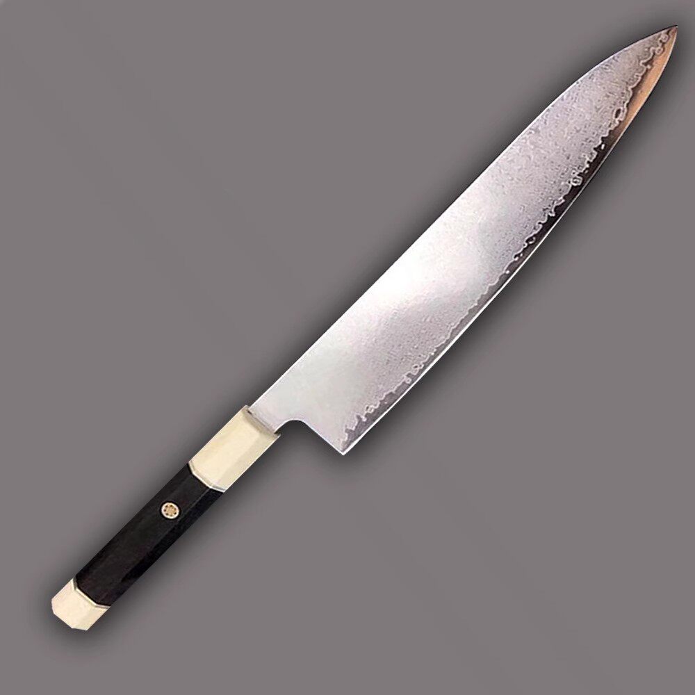 柄部用料大氣,手工打磨八角柄,雙合仿牙料搭配黑檀木,喜歡的朋友們趕緊下手、此款性價比超高的大師廚刀