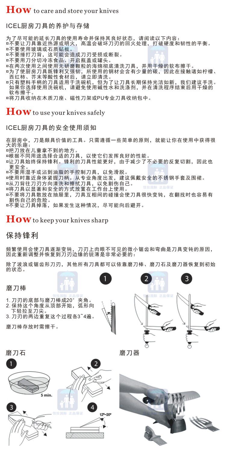 - 刃材采用X50CrMoV15高碳鉬釩不銹鋼, 質地堅硬耐磨且具有高抗腐蝕性,常保鋒利。德國刀具制造商多使用這種鋼材。