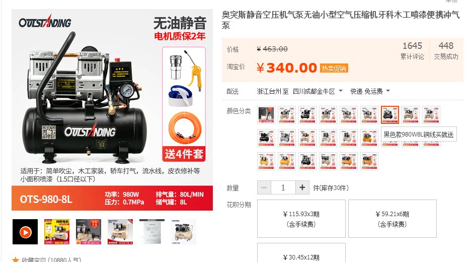 淘寶上品牌的空壓機340元起 無油靜音。 我們廠沒有空壓機,我們是幫忙代買,我們建議買家在當地購買,不從我們這里購買氣泵(空壓機)