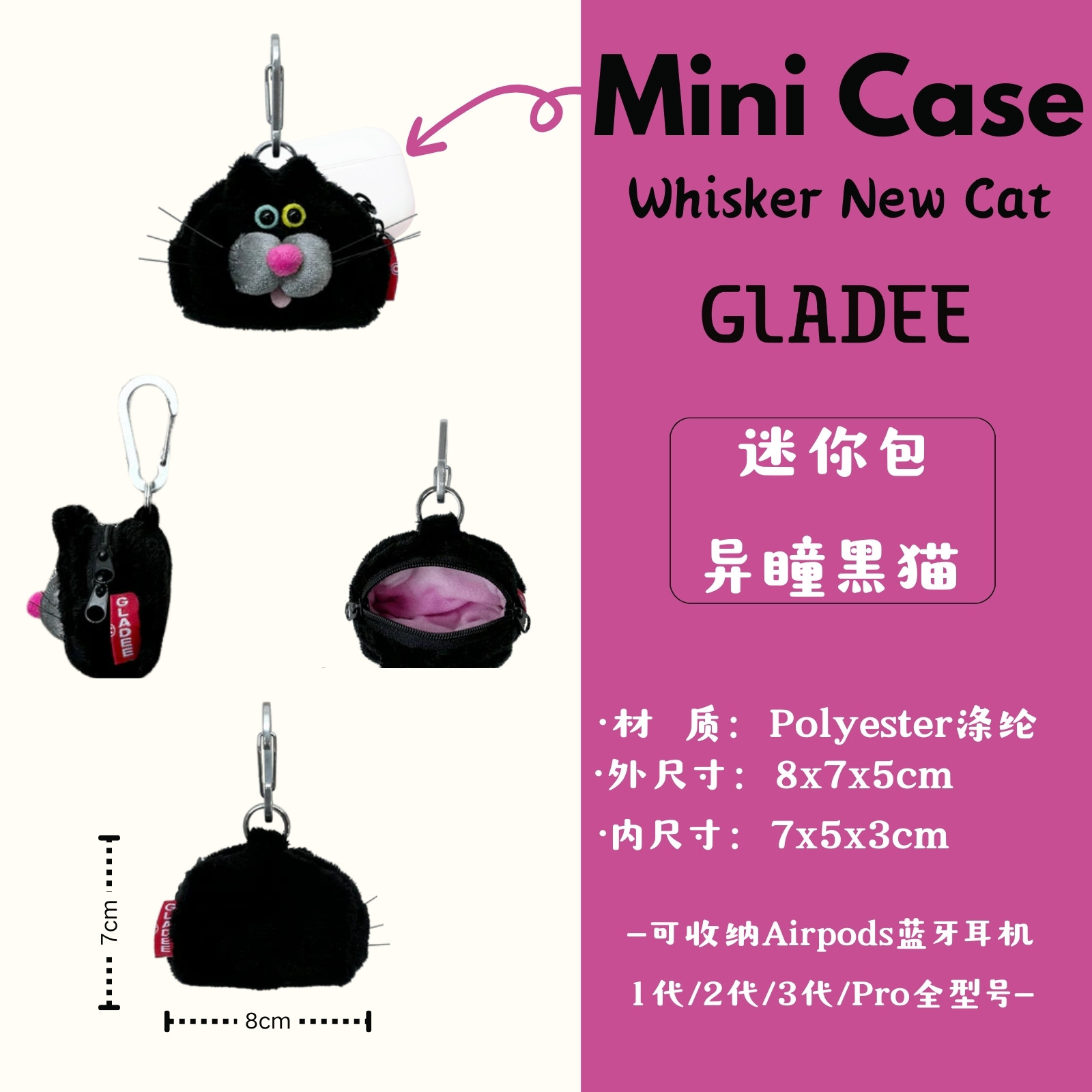 This mini pouch fits tightly on your AirPods or AirPods Pro. zipper. with carabiner. Blue & Yeloow Odd-eye. Charming mouth. High resilience foam. Soft coat. Soft inner.