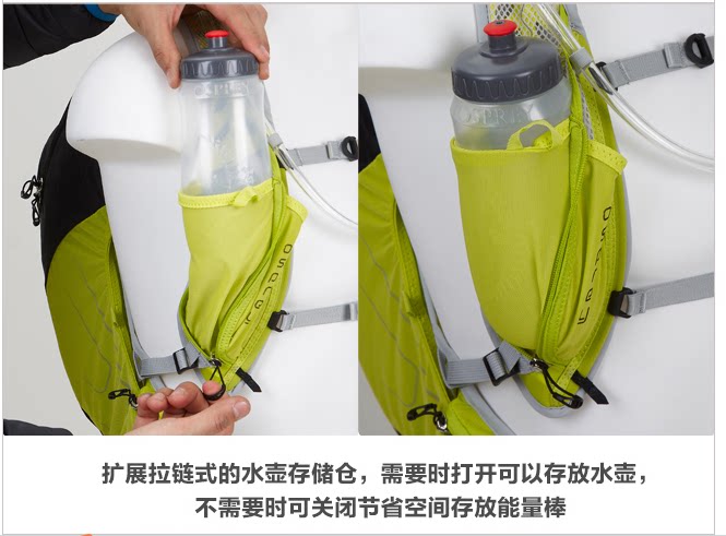 二、產品特色:兩個彈力網紗肩帶 + 彈力網紗側兜 + 肩帶包配有用于裝水壺的拉鏈擴展套 + 帶拉鏈的彈力網紗腰帶包