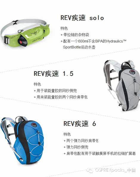 REV疾速背包系列使用全新的BIOSTRTECH肩帶和腰帶,結構采用開孔泡沫覆蓋透氣網紗,外層柔軟且無刺激性,貼合、透氣。DigiFlip多媒體存放袋為越野時的數碼產品提供便利的使用及存放條件。改良的直拉式ErgoPull腰帶系統,讓跑者輕松穿戴。雙胸帶的設計,提供了額外的穩定性,讓背包與跑者一同跳躍。