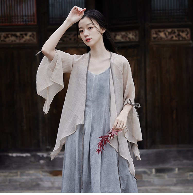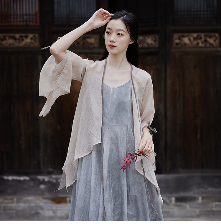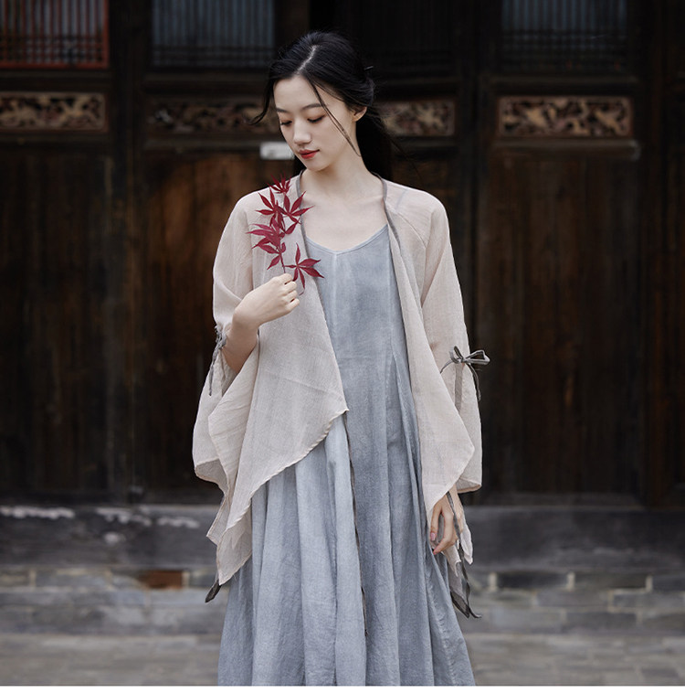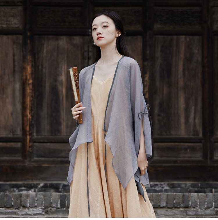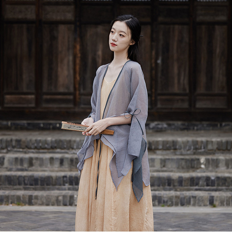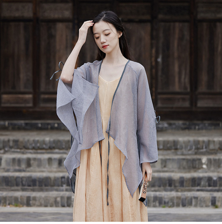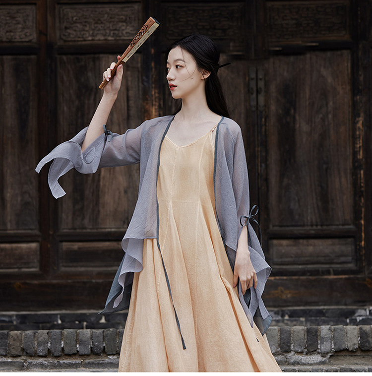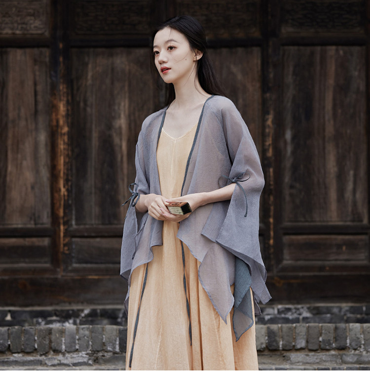 冰麻+滌綸混紡面料,輕薄又透氣胸前系帶設計,可交領漢服式穿著, 隨意散開就很仙垂下來隨風飄飄 高ji感就來了喇叭袖設計,滿滿的仙氣氛圍感搭配小吊帶 或者吊帶裙,就hin好看了夏天在空調房里隨手搭搭也合適衣櫥里一定要有的一件衣長88-81cm,胸圍94cm,袖長66cm,袖口36cm注:實際顏色偏暗偏深!模特室外陽光下拍攝會比較淺,介意色差的請勿慎重下單!!!