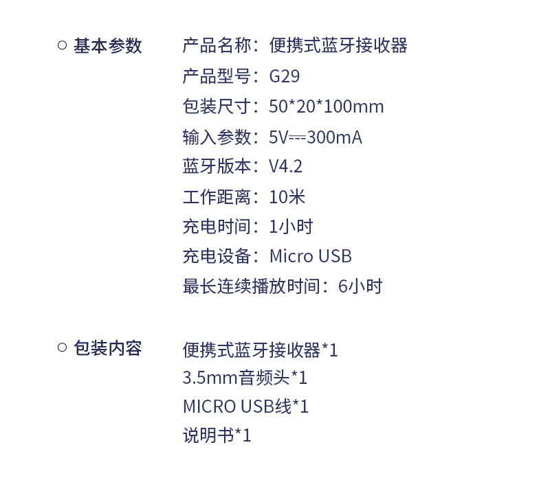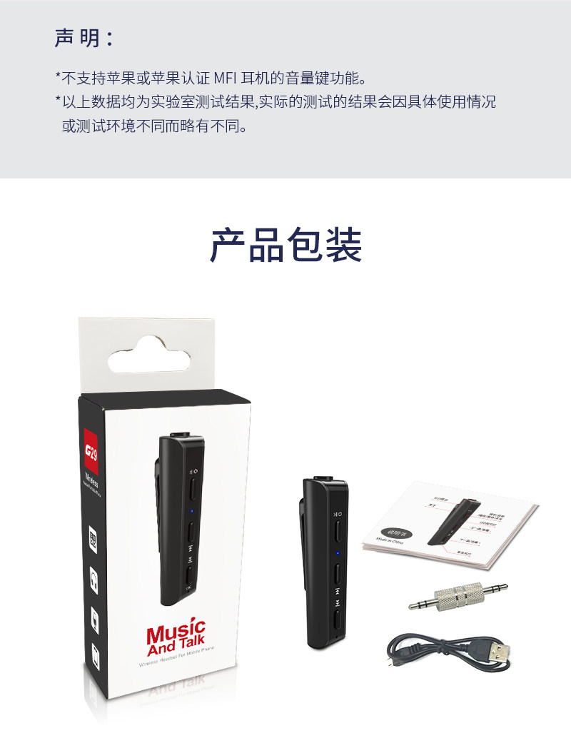 G29 是公司開發設計的藍牙接收的藍牙4.2音樂接收器。產品采用JL杰里芯片設計,高端集成芯片具備了完美音質,低功耗等特點;它可以實現藍牙接收功能,可以更方便地與你的音響設備連接配對;在使用 上我們使用按鍵方式操作,簡單方便,在享受完美音樂時能體會到高大上 的感覺。