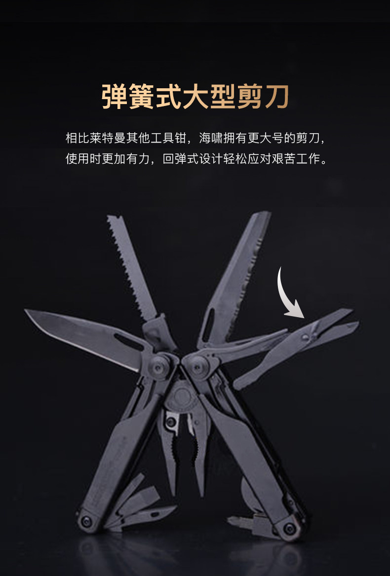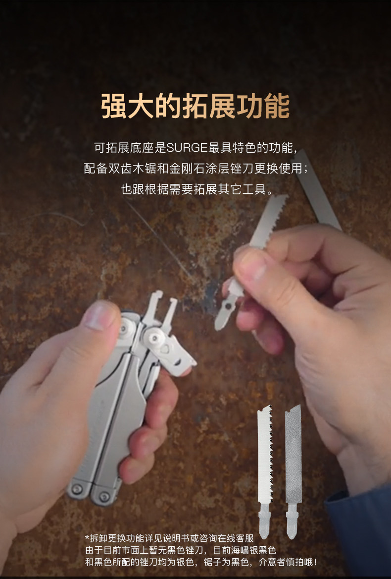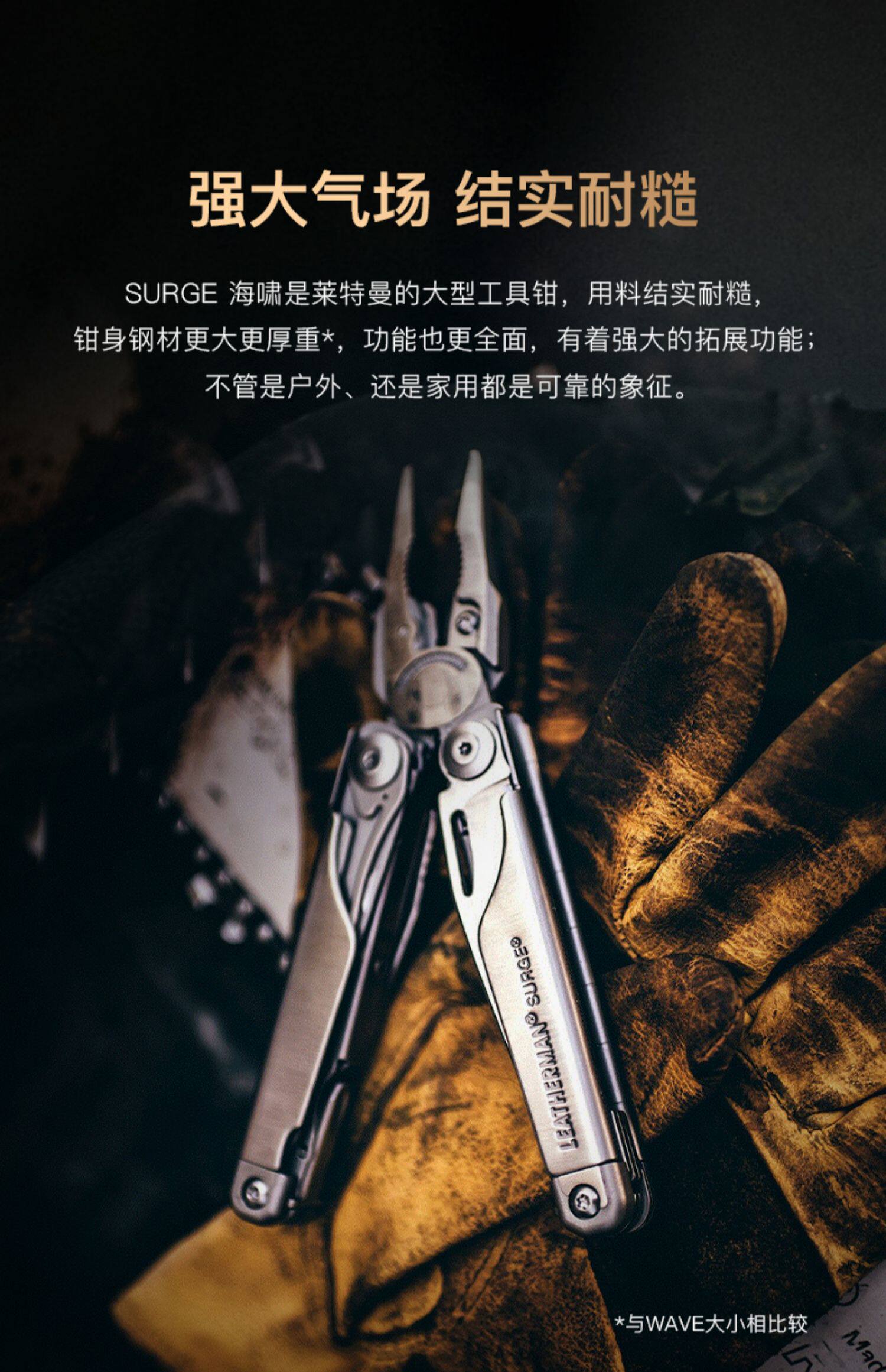 此款SURGE“海嘯”被萊澤曼官方歸為“HEAVY DUTY”系列,意即“能勝任重活”;它是萊澤曼多功能工具家族中當之無愧的巨無霸。波浪WAVE的強化版,整體更大,鋼材更厚重,功能也更多,是一款可靠性強、實用性強的工具鉗。