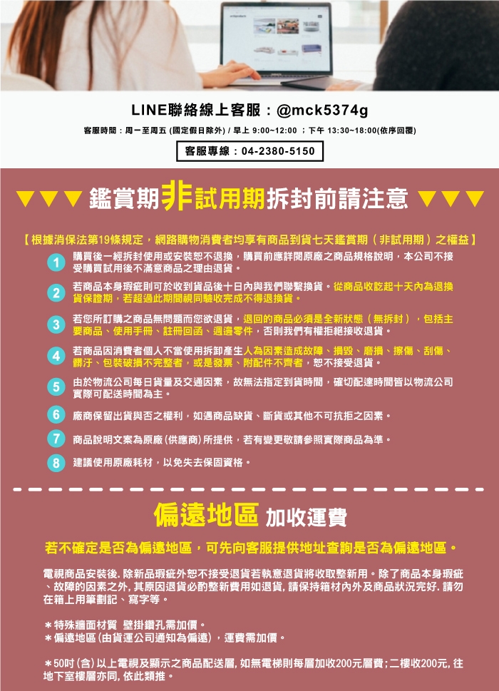 原廠三年保固,商業/公共場所用途一年保固(內容以原廠規定為主)