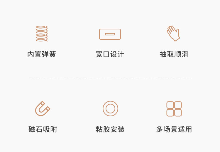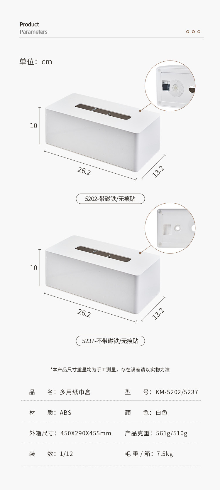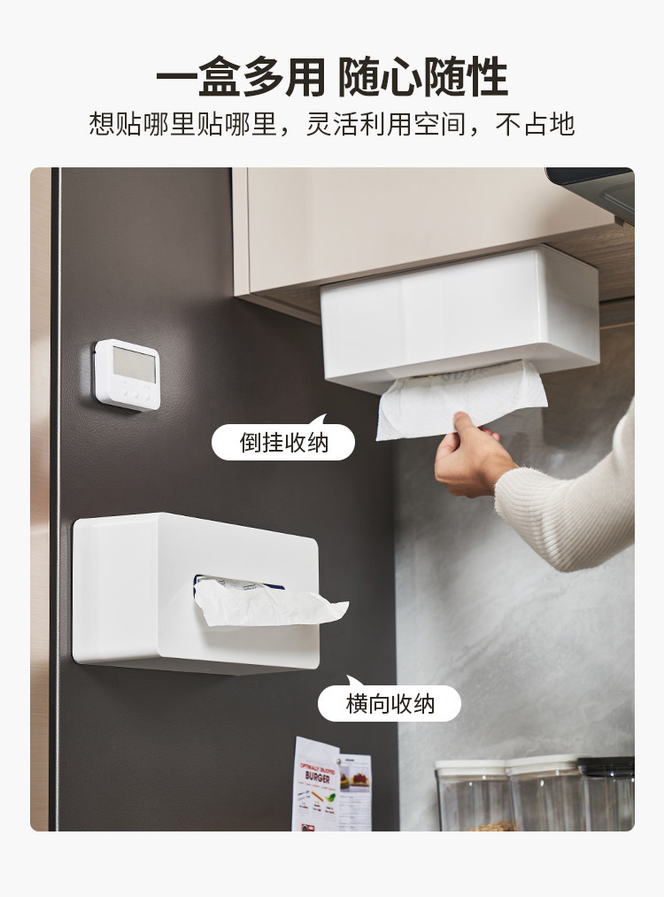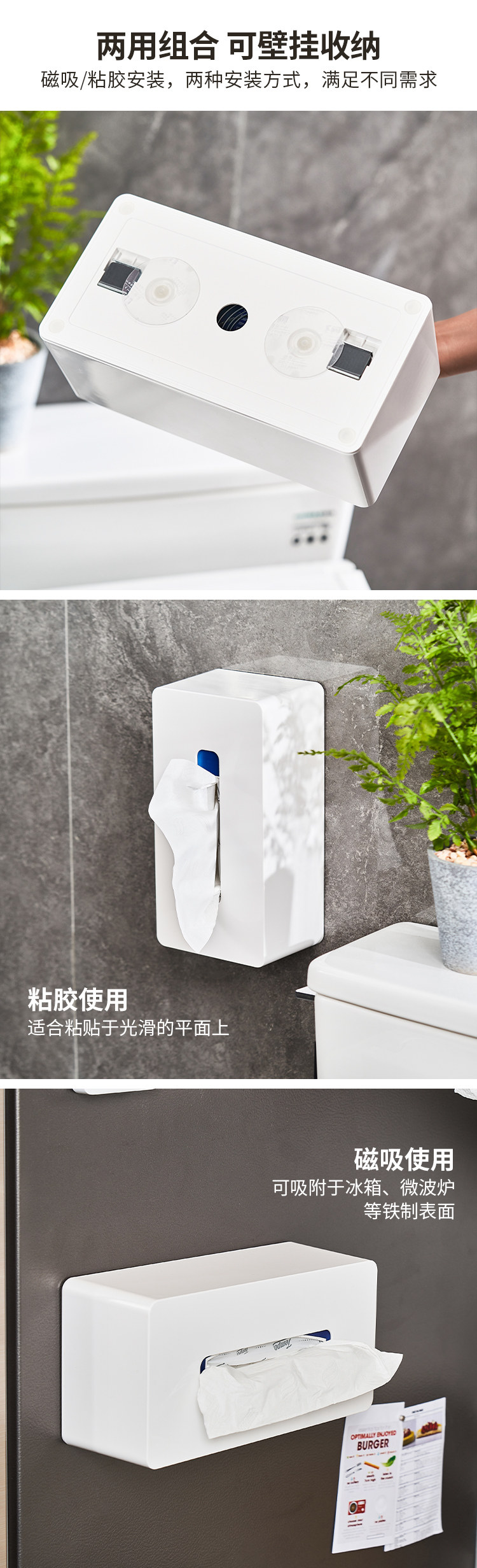 出了具備【普通款】的特點外,紙巾盒底座加配了2塊磁鐵+2片無痕膠,可以吸附到冰箱等鐵制品上,也可以粘貼到光滑的瓷磚、玻璃、油漆墻面!