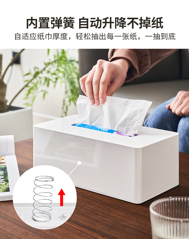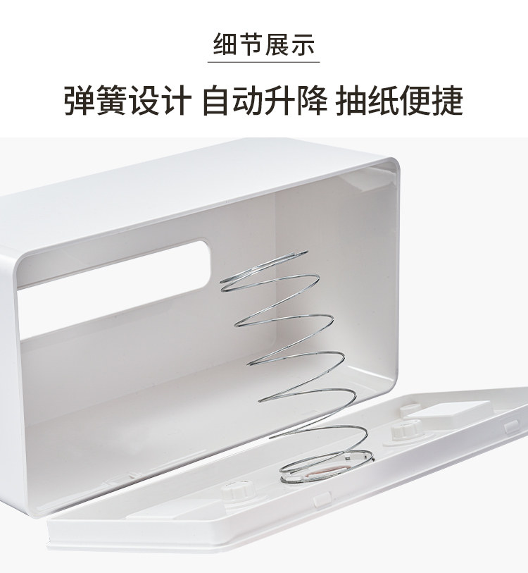 不過這個做了個創新設計就是紙巾盒的內部加了彈簧,能把紙巾頂到上面,這樣解決了隨著抽紙使用后逐漸減少抽紙沉底變的難以抽取的問題