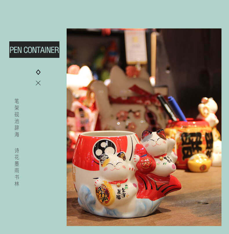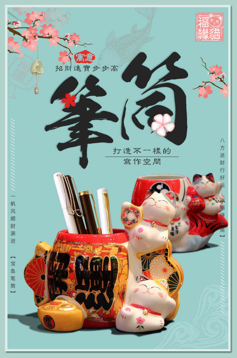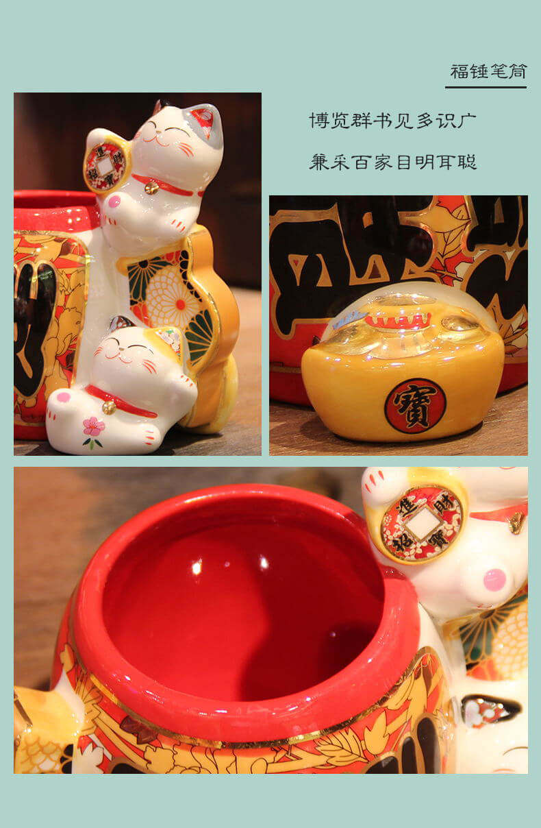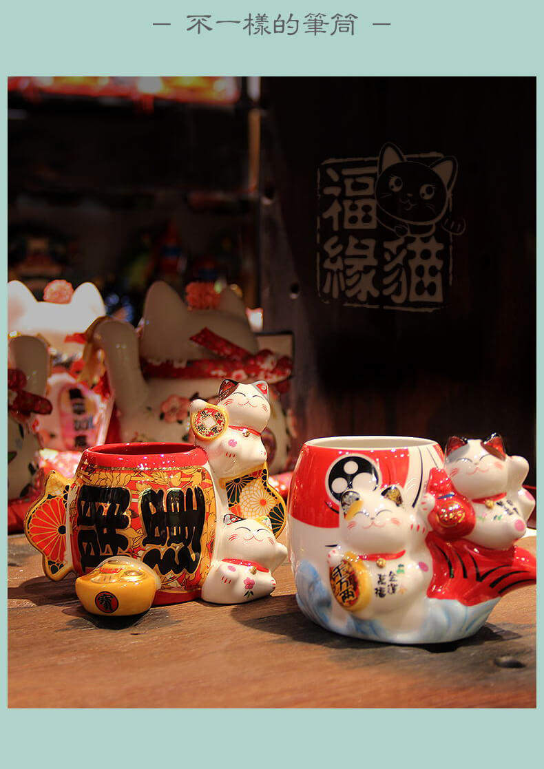 辦公室用品擺件創意可愛招財貓筆筒復古中國風桌面收納罐陶瓷禮品