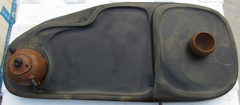從茶盤的使用性能上看,木質和竹質茶盤均處于劣勢,使用年限不長,容易干裂變形,積茶垢不易清洗,且有異味。金屬茶盤,雖材質可靠,外表光亮,不易吸水不變形等優點,但其材質決定了它在工藝上和外觀上的單調性,千篇一律。在視覺上的美感欠佳,與中國獨有的茶文化格格不入。