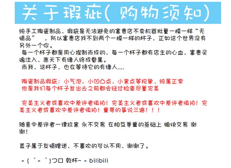 購買需知:蓋子跟勺子只是送的小禮物,不是配套的!數量有限!比較稀有!所以沒有挑,能用就下了,可能會有瑕疵,或者小裂縫,但都是不影響使用的,不喜歡可以不用!有時候漏發了或者因為物流原因破碎,請恕小本生意補發不了,只能下次買杯子的時再補發!本店只保證您的杯子問題,蓋子跟勺子只是贈送的!漏發跟瑕疵均不負責!
