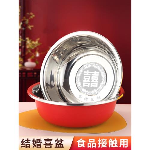 不銹鋼盆食品級喜盆家用洗臉盆紅色面盆好事新婚嫁妝婚慶盆子套裝
