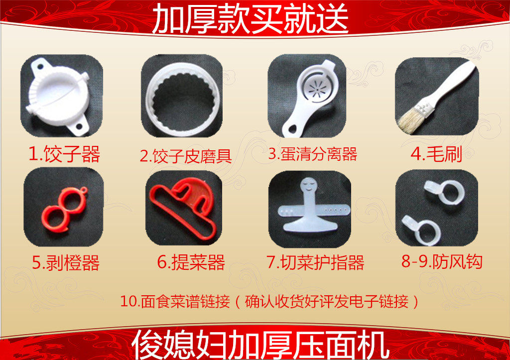 為了感謝新老客戶的支持,特惠價錯過了可別后悔!目前購買加厚款壓面機就送禮品(裸機不配送)親們可看下送的禮品清單。