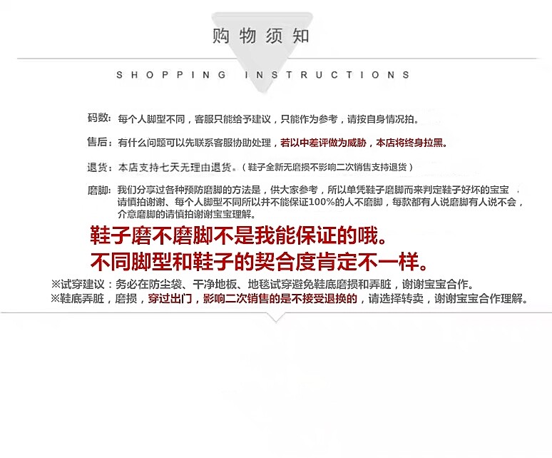 【退換貨請保證鞋子全新無磨損無試穿痕跡,鞋底膜完好,請墊一個包裝墊試穿 請反復試穿清楚,謝謝寶寶合作】
