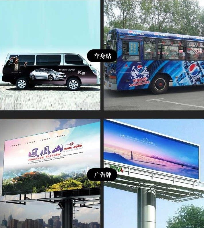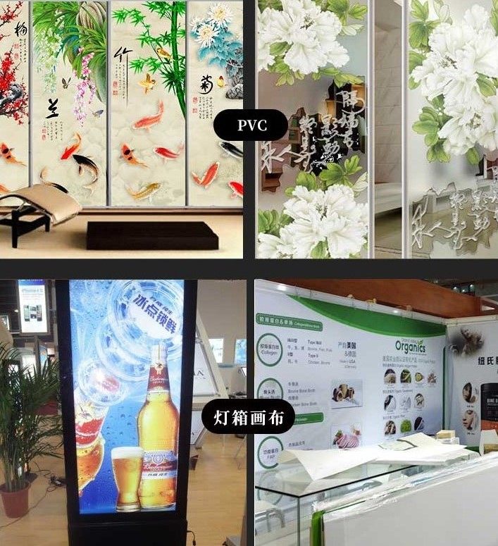 金卡、銀卡、投影片、膠片、透明背膠(PET)、透明膠片、保鮮膜(PE、PVC)、玻璃、瓷磚、KT板、車身廣告、燈箱廣告、戶外海報、商店招牌、弱溶劑燈片、相紙等。
